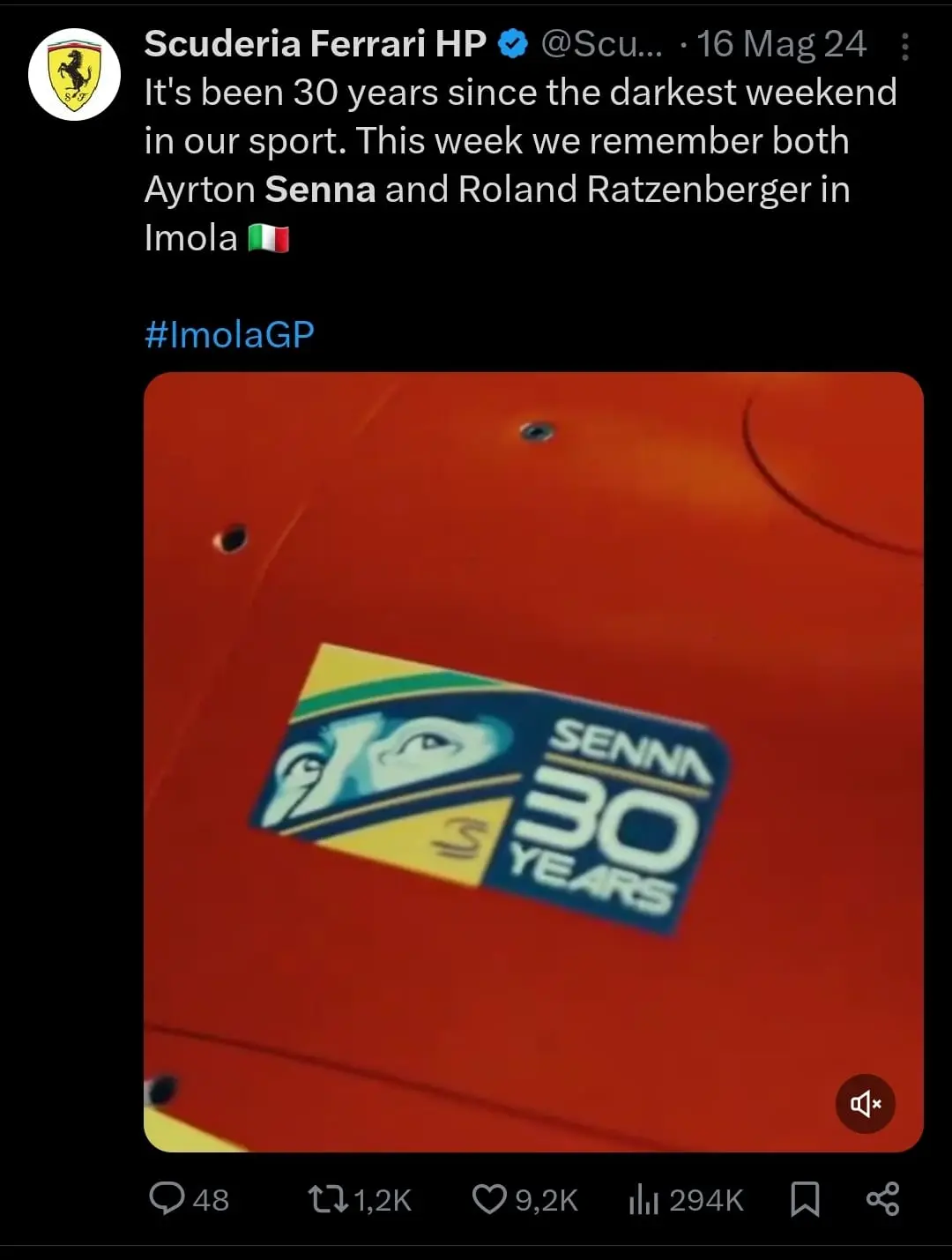 Ayrton – giustamente – è stato ricordato anche dalla Ferrari come da tweet qui sopra. Perché qui non si sta dicendo che non dovesse essere fatto (non sia mai) ma che, a maggior ragione, se viene ricordato un pilota scomparso e che alla Rossa ha tolto un mondiale con una tamponata storica a Prost (1990), diventa incomprensibile capire come mai chi ne ha fatto la storia, conquistando da solo un terzo di tutte le vittorie della Rossa (il 29%, 72 vittorie su 248), meriti di essere snobbato totalmente, oltretutto dopo 12 anni da un incidente che ne ha segnato la vita.
