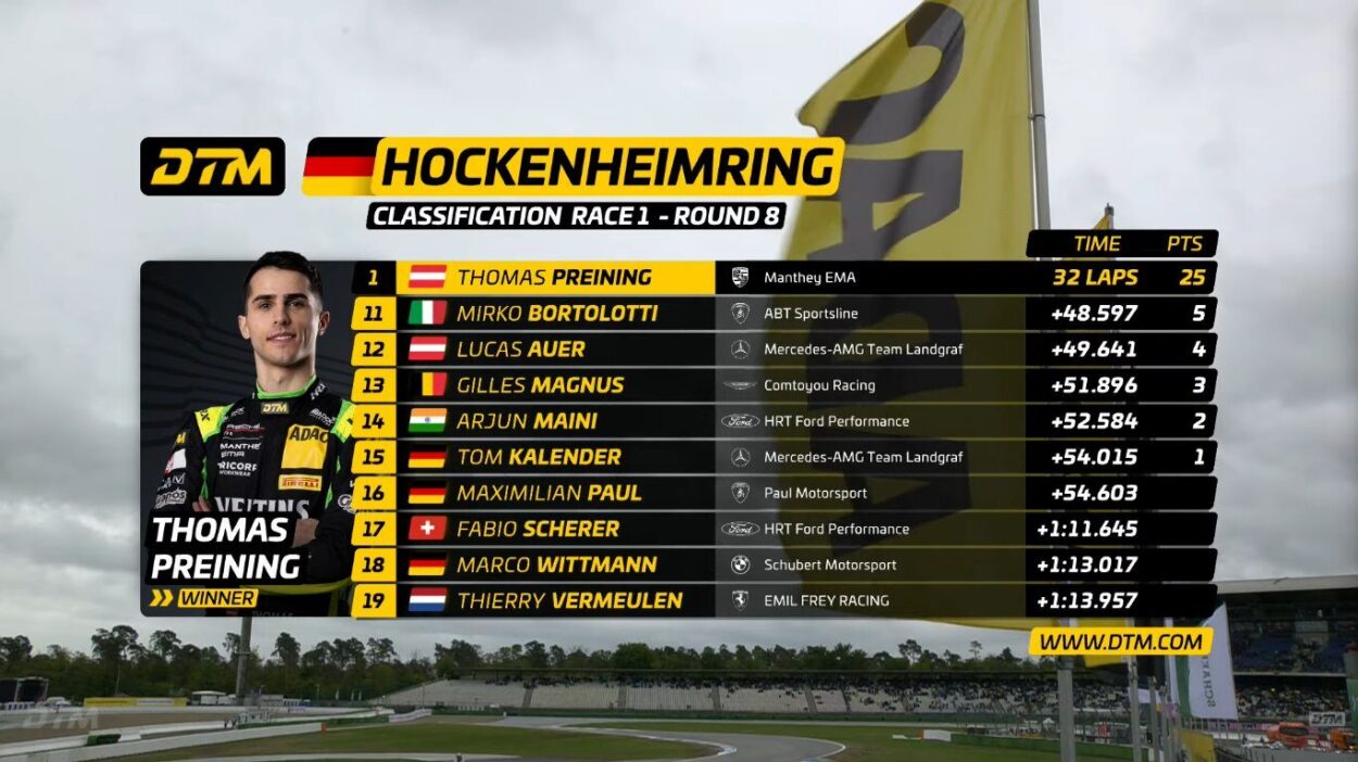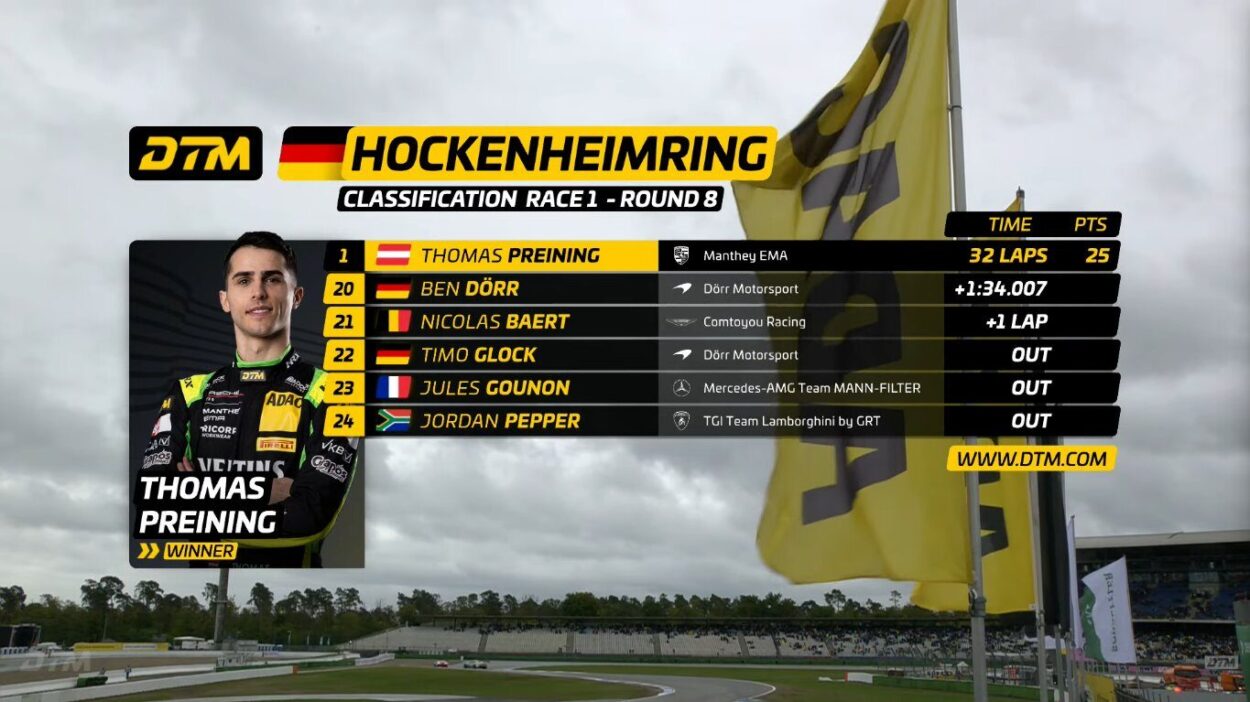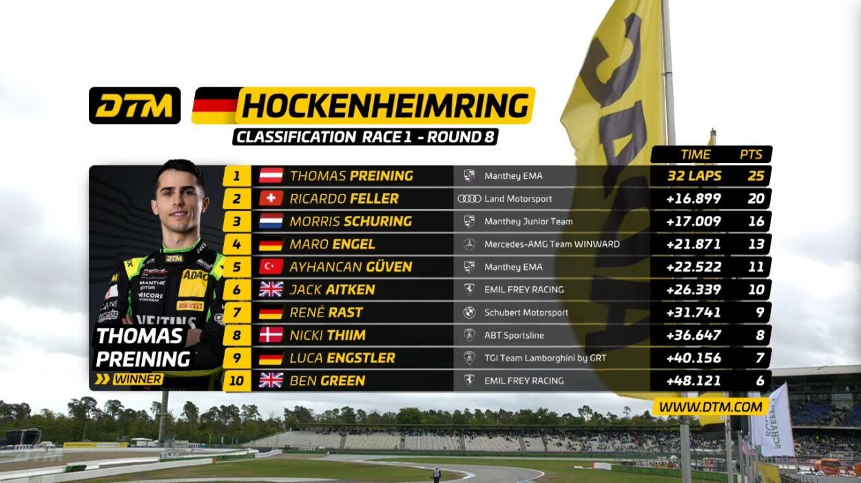 Thomas Preining trionfa sul bagnato di Hockenheim davanti a Ricardo Feller e Morris Schuring: il pilota della Porsche di Manthey EMA riapre i giochi con una super gara in condizioni difficili, passando i rivali tutti nel primo stint e dominando per il resto della gara. Quarta posizione per Maro Engel e quinta per Ayhancan Güven, entrambi abili a passare un Jack Aitken in difficoltà nel finale di gara, solo sesto.