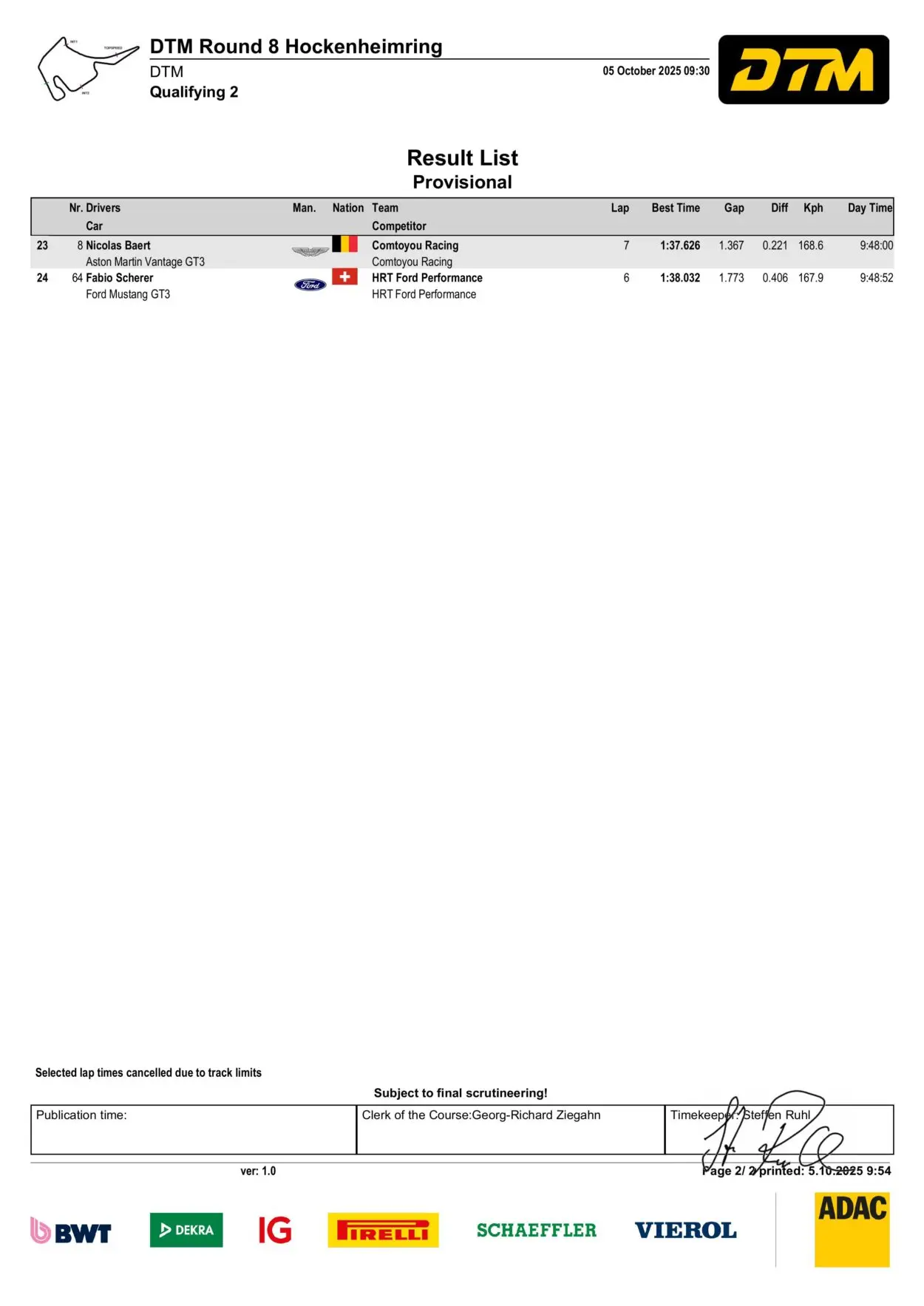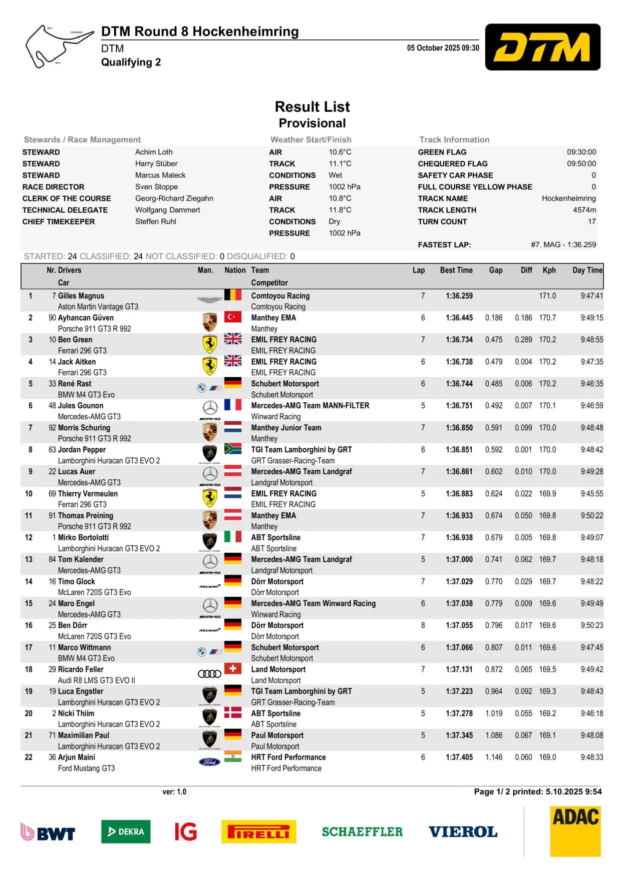 Magnus, con la sua Vantage GT3, ha fermato il cronometro sull’1:36.259, un tempo a cui nessuno si è riuscito ad avvicinare, considerando i 188 millesimi di distacco presi da Ayhancan Guven, autore del secondo miglior tempo. Il turco, alfiere del team Manthey, riesce comunque a portare la sua Porsche 911 GT3 in prima fila e a porsi in una posizione di ottimo vantaggio in ottica del rush finale di questo pomeriggio che assegnerà il titolo di campione 2025 del DTM.