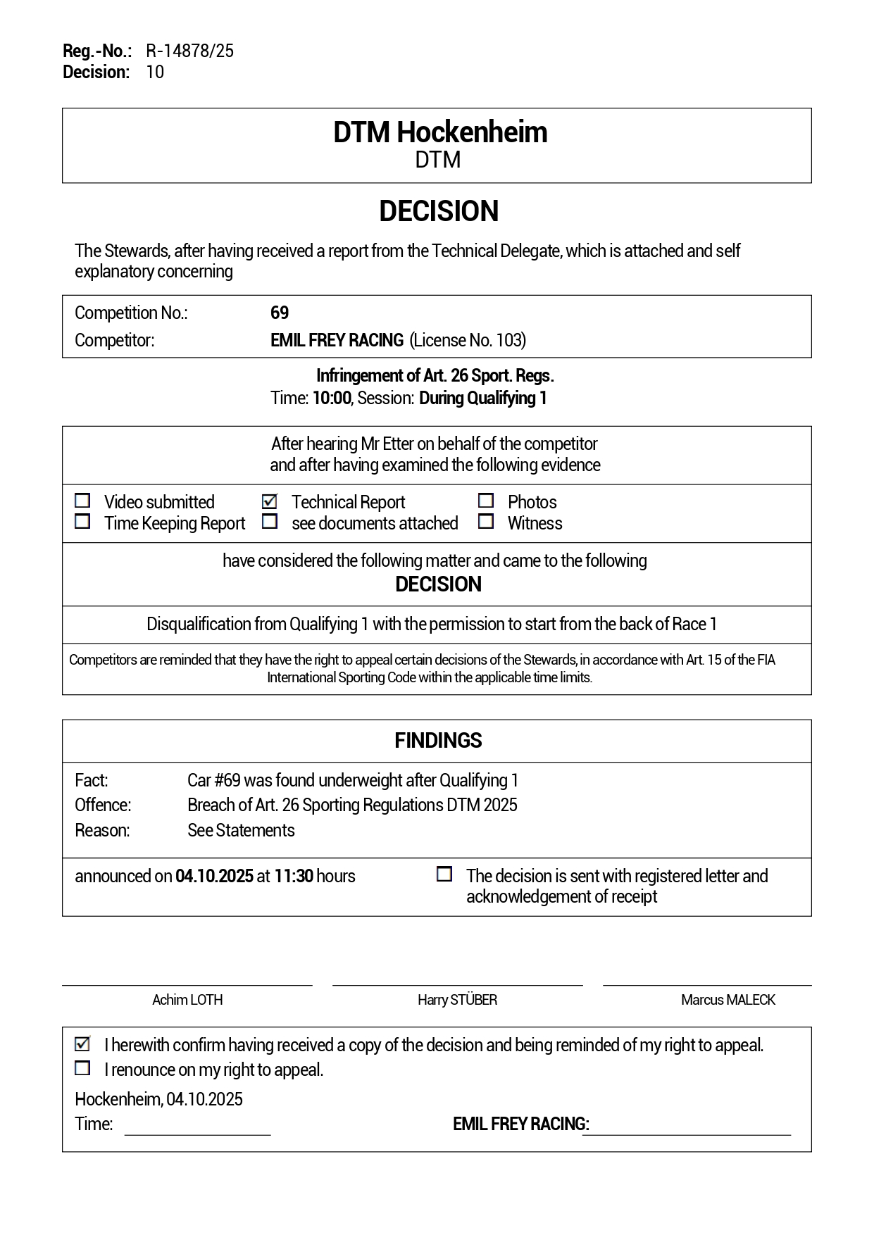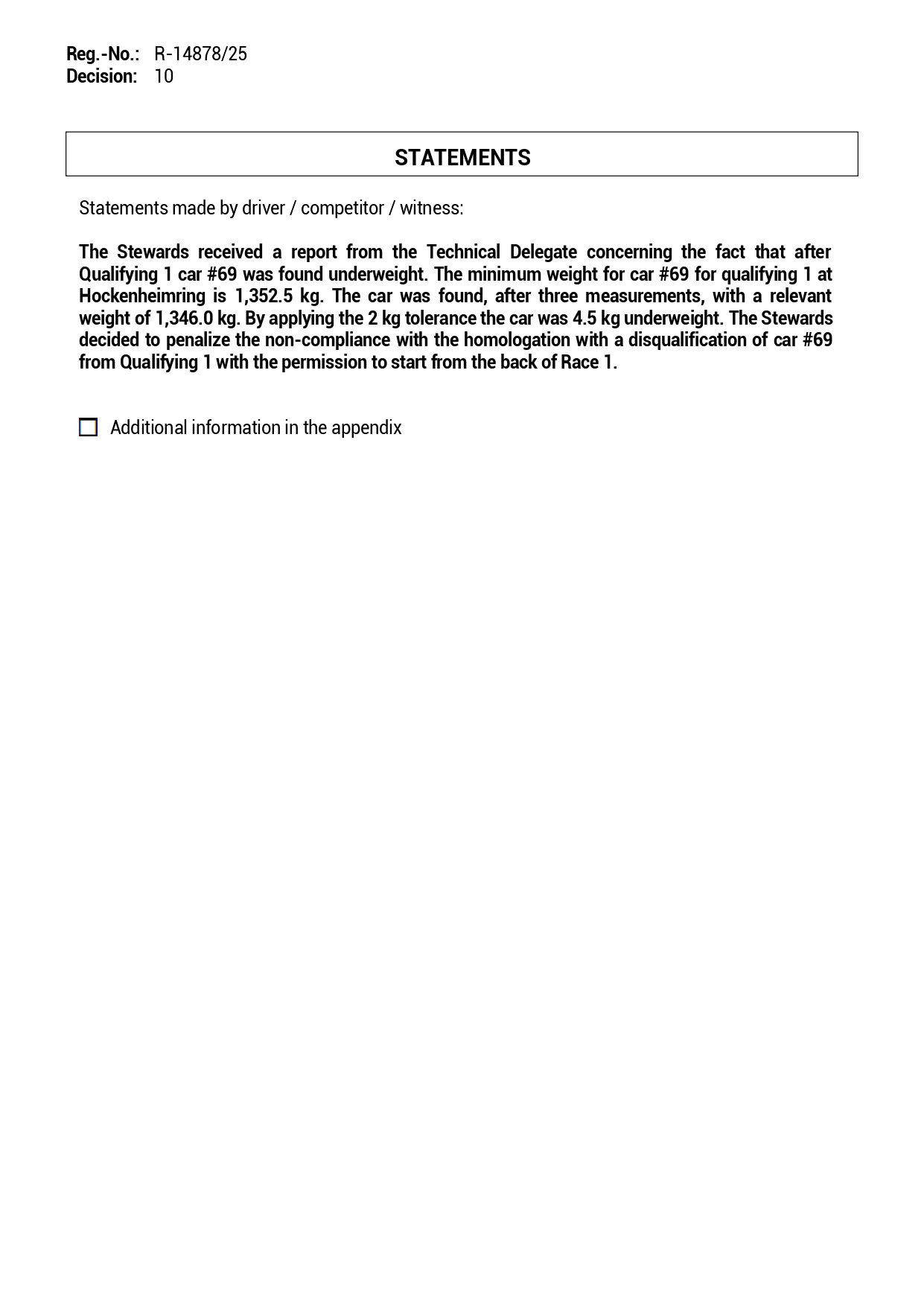 Thierry Vermeulen è stato squalificato dalla qualifica: il pilota olandese si era classificato terzo contribuendo alla tripletta delle Ferrari di Emil Frey Racing, ma dopo la sessione la sua vettura è stata trovata sottopeso, costringendo i commissari a squalificarlo. Vermeulen partirà così in ultima posizione, con tutti i piloti dalla terza posizione in giù che ottengono una piazza: Thomas Preining eredita così la terza piazza, mentre tra i contendenti al titolo Engel partirà settimo, Rast nono, Pepper tredicesimo e Auer diciassettesimo.
