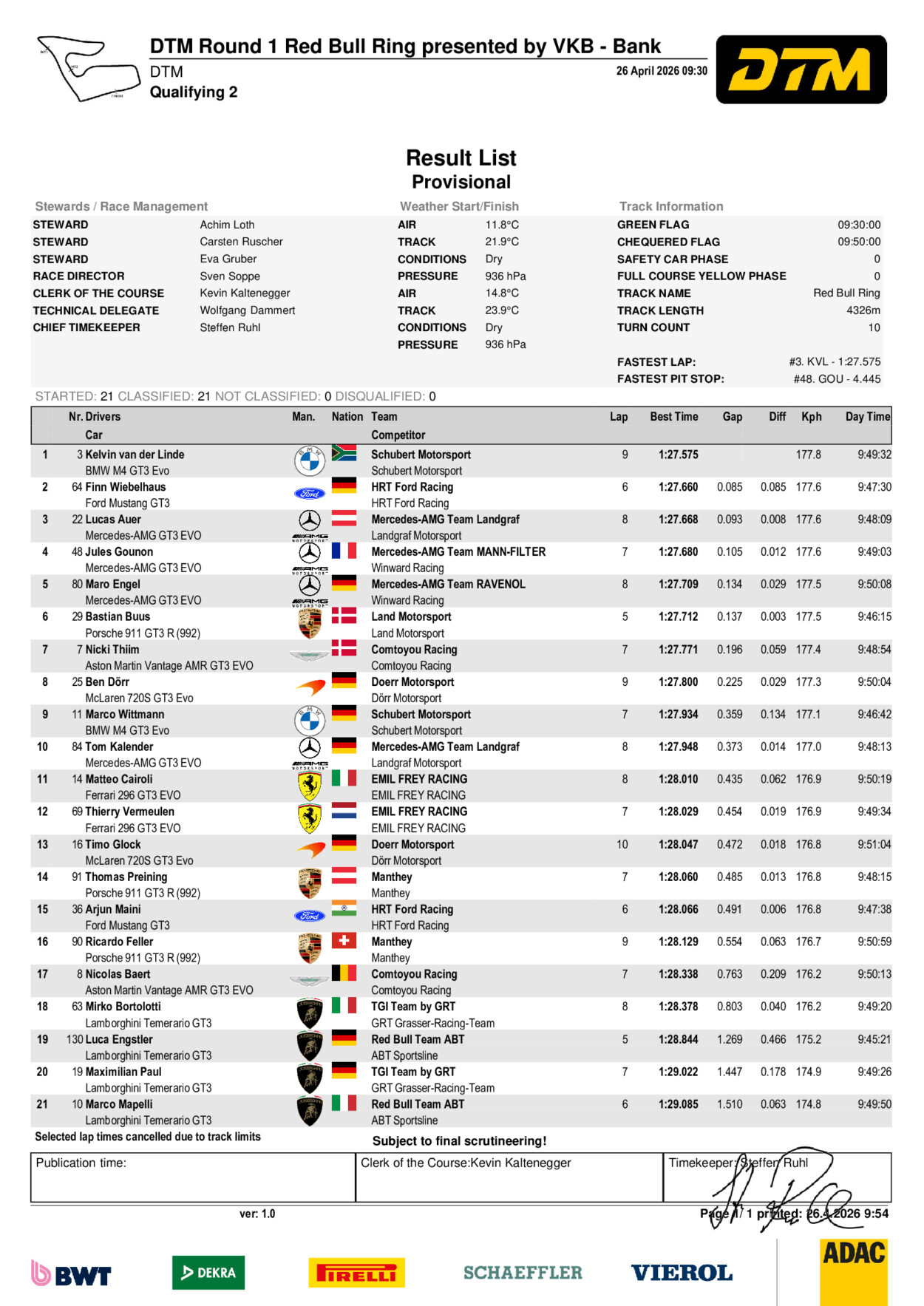 Dopo il ritiro avvenuto negli ultimi giri di Gara 1 e la successiva squalifica, Kelvin van der Linde può finalmente sorridere: il pilota sudafricano della BMW di Schubert Motorsport partirà dalla pole position in Gara 2 al Red Bull Ring, risultato ottenuto grazie al miglior tempo della seconda sessione di qualifica del weekend in 1.27.575. Per van der Linde si tratta della decima pole position nel campionato tedesco, e proverà a anche lui a rompere il digiuno che dura dalla prima gara di Hockenheim 2024. A fianco del sudafricano scatterà in prima fila il rookie Finn Wiebelhaus con la Ford Mustang di HRT, staccato di 85 millesimi dalla vetta.