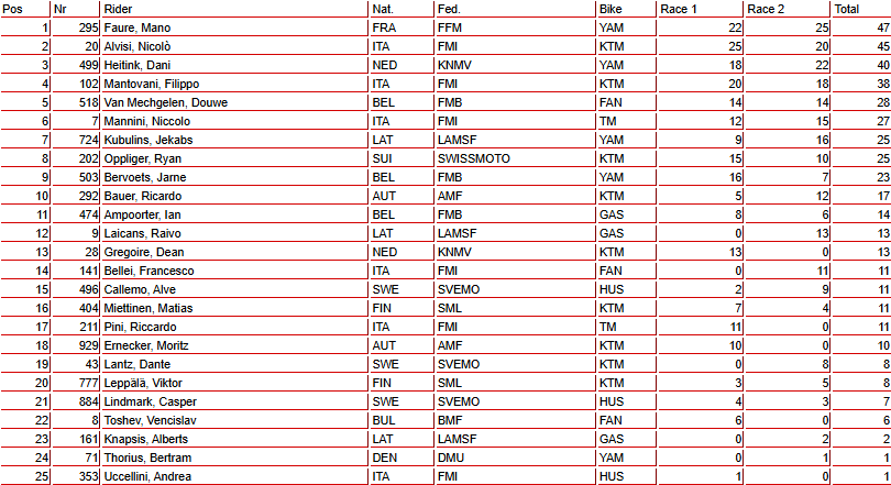Per i colori italiani non è mancato all’appello Filippo Mantovani, terzo in gara-1 e quarto in gara-2 dopo avere gettato alle ortiche un’ottima occasione. Il pilota del team KTM MTA si è improvvisamente ritrovato alle calcagna di Faure all’ultimo giro della seconda manche, ma nel tentativo di acciuffare una clamorosa vittoria è finito a terra pregiudicando così ben due posizioni. L’errore lo ha lasciato anche giù dal podio assoluto in favore della seconda Yamaha di Dani Heitink, quarto e terzo.