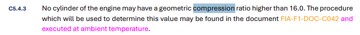 Con un nuovo regolamento tecnico vengono a galla anche le famose “zone grigie”, quel detto / non detto che rappresenta pieghe all’interno delle quali muoversi per ottenere un vantaggio. In questo caso si parla di “rapporto di compressione”, ovvero il rapporto tra il volume massimo e il volume minimo presenti all’interno di un cilindro, corrispondenti rispettivamente alla posizione del pistone al Punto Morto Inferiore (PMI) e al Punto Morto Superiore (PMS).