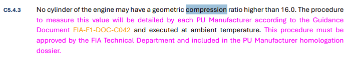 Questo rapporto, fino al 2025, doveva essere di 18.0 ed è stato abbassato a 16.0 per quanto riguarda le PU 2026, che avranno una potenza massima inferiore rispetto al precedente ciclo. L’indicazione è stata aggiornata man mano: quelle che seguono sono le versioni di giugno, ottobre e dicembre del regolamento tecnico all’articolo 5.4.3.