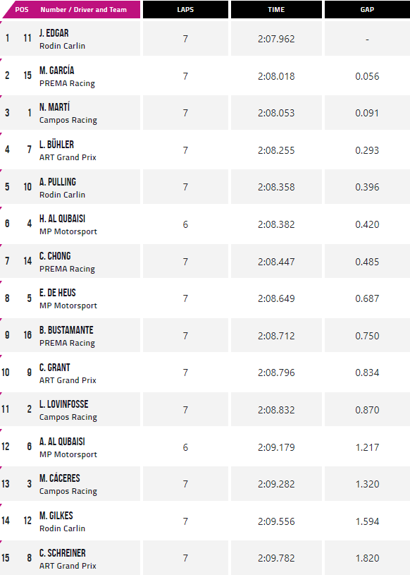 Prima della pole per gara-3 Edgar ha segnato il quinto miglior tempo nella QP1 mentre nella QP2 è stata Pulling a chiudere la top 5, entrambe in forza al team Carlin. Il trend calante di Hamda Al Qubaisi iniziato a Monza si è confermato anche ad Austin, con un ottavo e un sesto posto: l’emiratina partirà dalla pole in gara-2, per effetto della griglia invertita, grazie ad un tempo restituito a Chloe Chong a turno ormai terminato. La britannica del team Prema è risalita in settima posizione, miglior qualifica stagionale ripetuta poi in QP2, togliendo la preziosa top 8 a Chloe Grant.