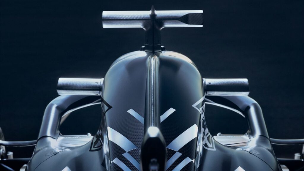La colorazione della nuova monoposto è bicolore, basata su un gioco di grigio chiaro (con dettagli cromati) e nero che vestono, invertendosi, i due lati. Il richiamo alla mente di tanti è quello della BAR 1999, un mix di due livree diverse “separate” da una cerniera che percorreva tutta la linea centrale dal muso fino al retro.