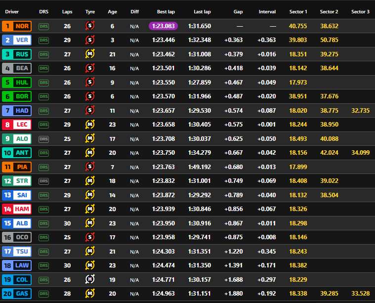 Dalla quarta posizione alla sesta sono tutte sorprese. Oliver Bearman, appunto, è quarto con la Haas a poco più di quattro decimi dal tempo di Norris. Alle sue spalle, sempre entro il mezzo secondo, troviamo addirittura le due Sauber di Nico Hulkenberg e Gabriel Bortoleto, con il team svizzero alla sua ultima gara della storia prima di diventare Audi.