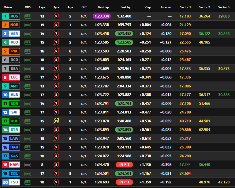 In sesta e settima posizione troviamo le due Haas, rispettivamente con Esteban Ocon e Oliver Bearman. Il francese ed il britannico hanno girato rispettivamente a 271 e 275 millesimi da Russell, precedendo la prima Ferrari di Charles Leclerc. Il monegasco è ottavo a quasi tre decimi e mezzo, apparentemente fuori dalla lotta per le prime posizioni in qualifica. Mattinata da dimenticare per Lewis Hamilton, a muro a metù sessione con la sua SF-25, dopo aver perso il posteriore all’ingresso di curva 8. Monoposto danneggiata all’anteriore e necessità di lavorare parecchio per essere pronti per le qualifiche.