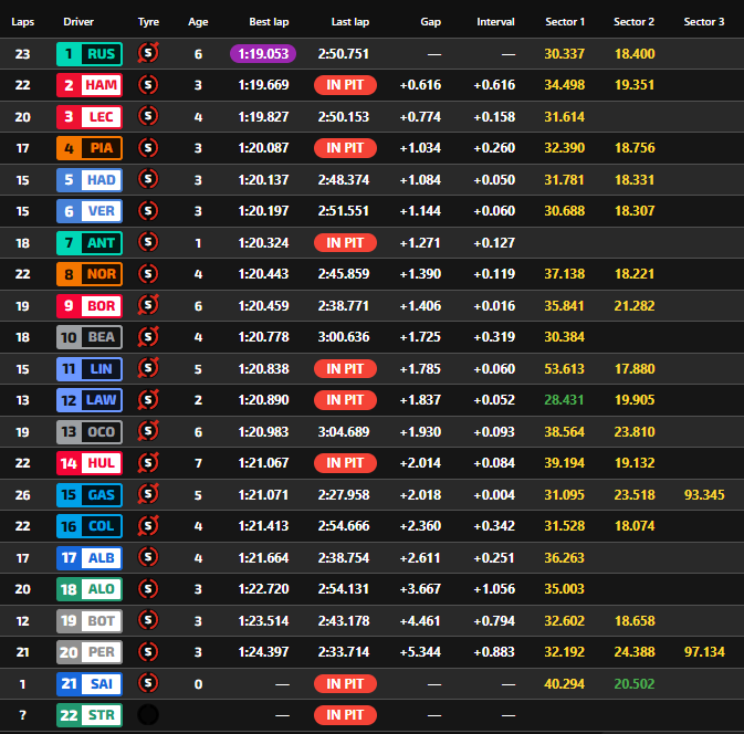 Come detto, le Ferrari per ora inseguono. Hamilton si è piazzato in seconda posizione nel finale, quando tutti i piloti si sono lanciati in un ultimo giro veloce dopo la rossa per l’incidente di Antonelli. Leclerc segue il compagno di squadra a un decimo e mezzo.