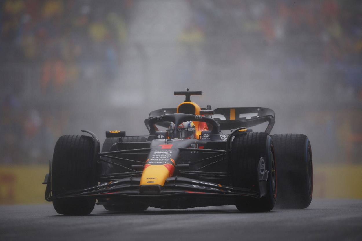 Verstappen segna il miglior tempo in una sessione bagnatissima. Lo spagnolo a muro con la SF-23