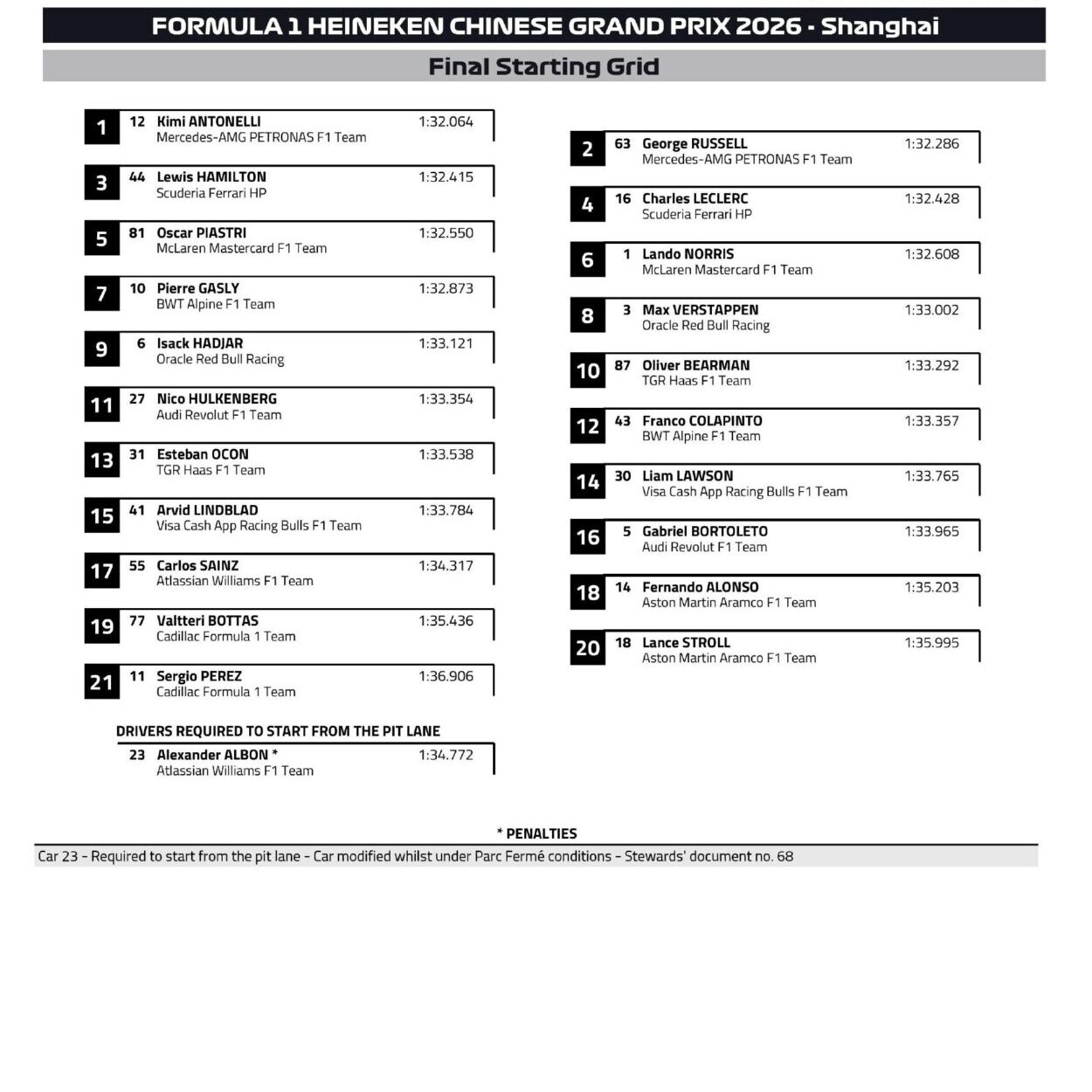 Segue la griglia di partenza del GP di Cina 2026, che scatterà alle 8:00 sul circuito di Shanghai. Kimi Antonelli parte dalla Pole con la Mercedes, affiancato da George Russell. Alle loro spalle le Ferrari di Hamilton e Leclerc, poi le McLaren di Piastri e Norris.