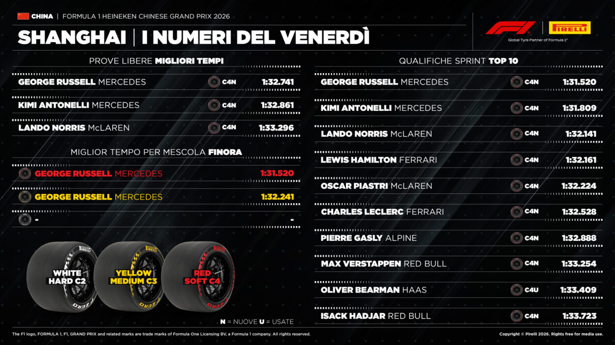 Il Pirelli Sprint Qualifying Award è stato consegnato a Russell da Dario Marrafuschi, Direttore Motorsport di Pirelli. Il trofeo è composto da un casco decorato con i colori della bandiera cinese e personalizzato con il nome e il numero di vettura del pilota che domani partirà nella Sprint dalla pole position e dalla riproduzione di un pneumatico P Zero Soft.