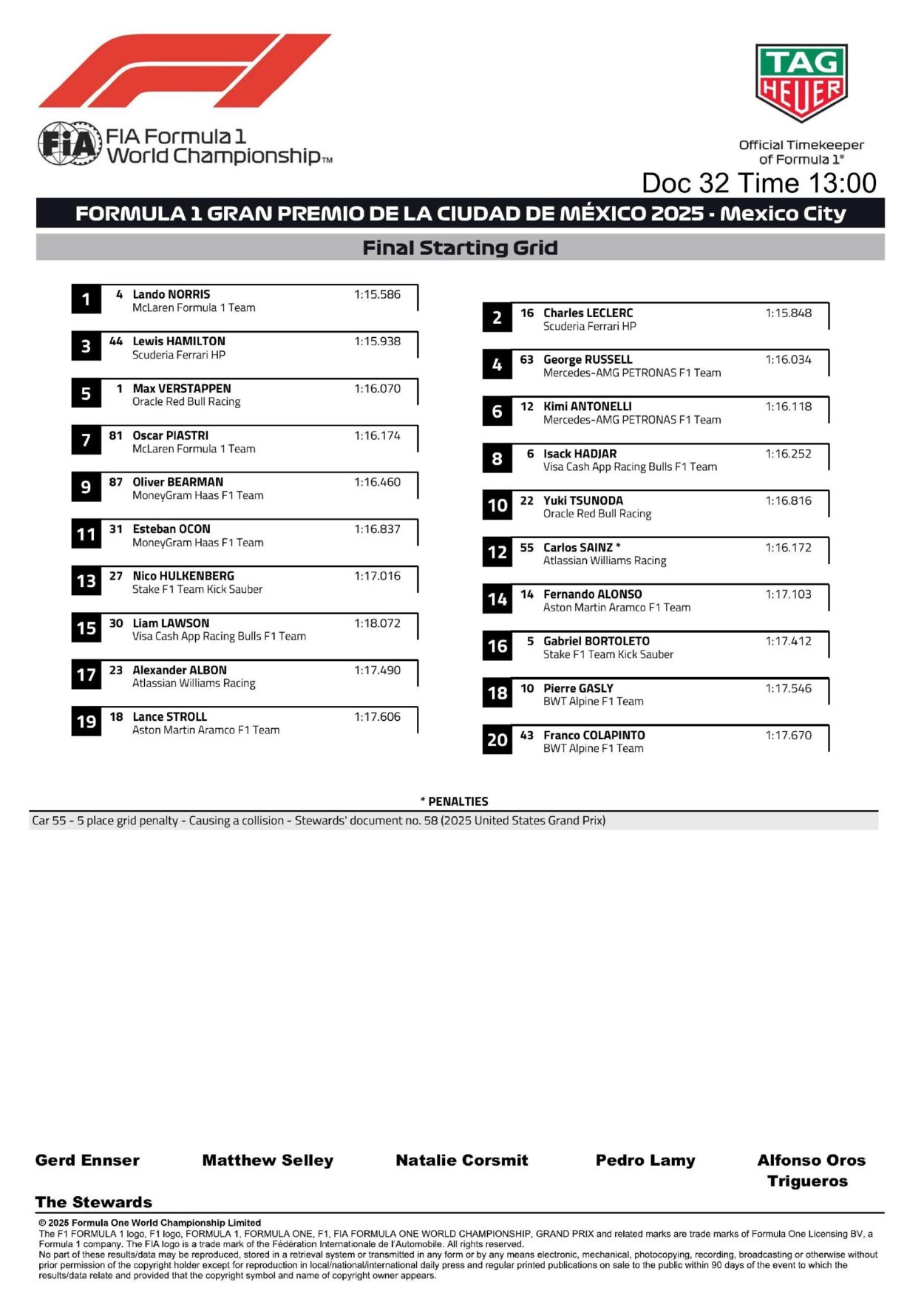 Segue la griglia di partenza del GP di Città del Messico 2025, 20a prova del mondiale di F1 che scatterà alle ore 21:00 sul circuito intitolato ai fratelli Rodriguez. Lando Norris partirà dalla Pole con la McLaren davanti alle Ferrari di Charles Leclerc e Lewis Hamilton.
