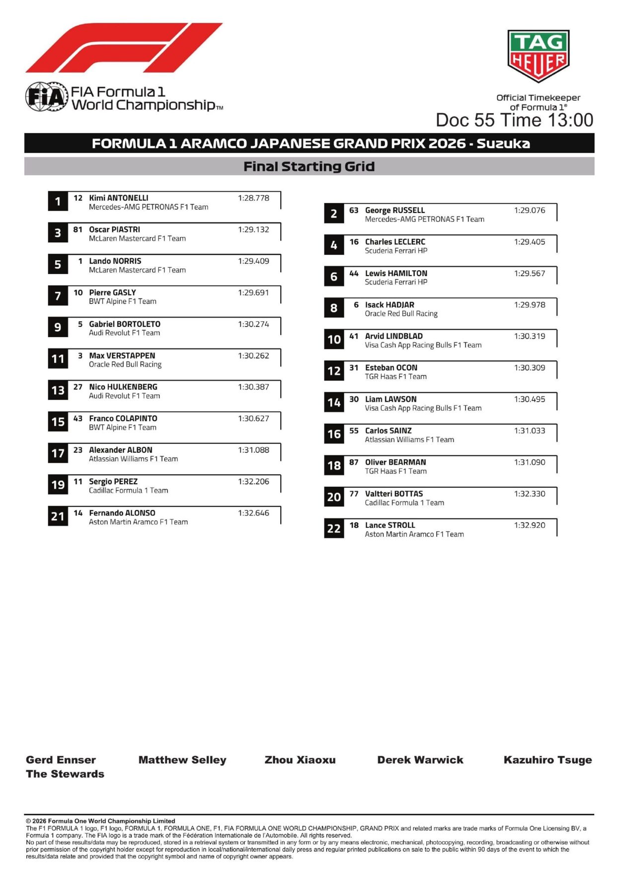 Segue la griglia di partenza del GP del Giappone 2026, terza gara del mondiale che scatterà sul tracciato di Suzuka. Kimi Antonelli è in pole position con la Mercedes davanti al compagno di squadra George Russell. In seconda fila la McLaren di Oscar Piastri e la Ferrari di Charles Leclerc.