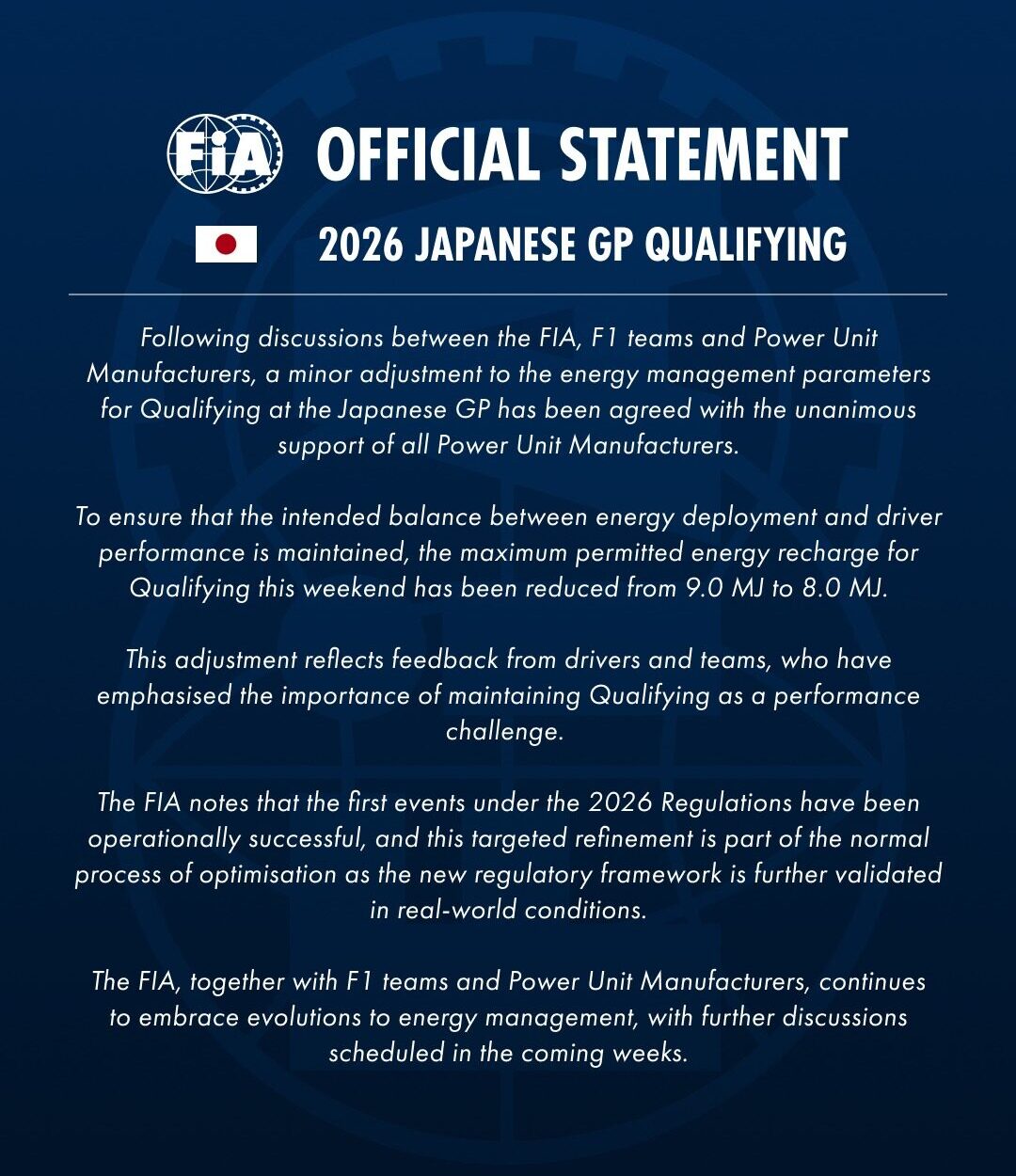 “A seguito delle discussioni tra FIA, team e motoristi, è stato concordato un piccolo aggiustamento ai parametri di gestione dell’energia per le qualifiche del Gran Premio del Giappone.
