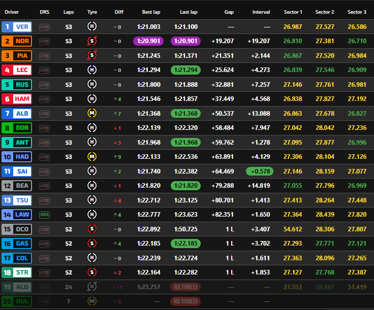 Dopo metà gara Verstappen comanda ancora con 6 secondi su, Norris, 12 su Piastri, 18 su Leclerc e 24 su Hamilton con Russell che si ferma al 28° passaggio per montare le gomme dure. Antonelli rientra ai box un giro dopo.