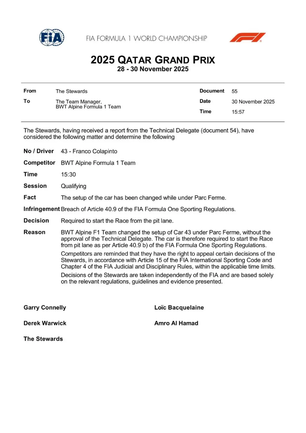 Franco Colapinto scatterà dalla pitlane nel GP del Qatar 2025. Sull’Alpine del pilota argentino è stato effettuato un cambio di setup non permesso in regime di Parco Chiuso. In questo caso la penalità automatica e porta alla partenza dalla corsia box.