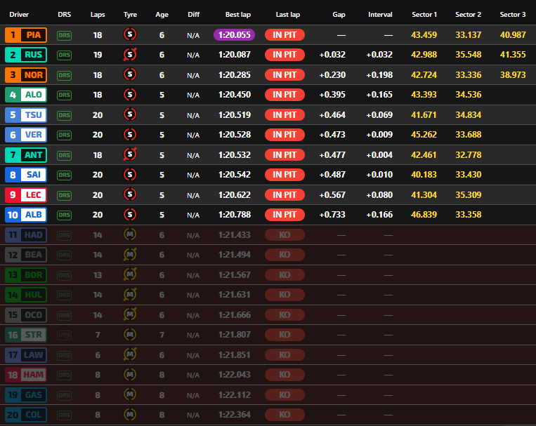 In SQ3, con gomme soft, vanno McLaren, Red Bull, Mercedes, Williams, Leclerc e Alonso. Stavolta sono le Mercedes a scendere in pista per prime, seguite da Verstappen. Antonelli gira in 1:20.903, Russell toglie quasi 4 decimi. Piastri toglie quasi tre decimi al tempo dell’inglese, Norris è secondo a 44 millesimi. Verstappen rimedia una brutta passeggiata nella ghiaia e abortisce il suo giro. Leclerc è momentaneamente 4° con un ottimo tempo ma scende fino alla nona posizione negli ultimi giri. Piastri si prende la Pole, Russell è secondo su Norris, Alonso è 4° su Tsunoda e Verstappen.