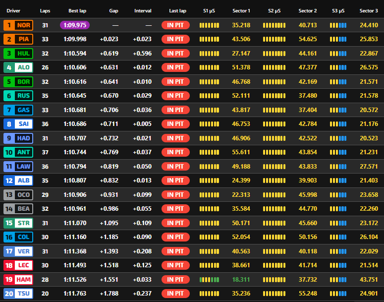 La top ten è completata da Isack Hadjar con la Racing Bulls e dalla seconda Mercedes di Kimi Antonelli, sotto gli otto decimi di ritardo da Norris.