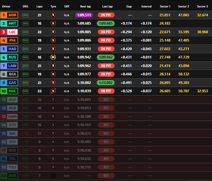 Una sorpresa di giornata è rappresentata dalle Racing Bulls, rispettivamente quinta e settima con Isack Hadjar e Liam Lawson. Tra di loro, in crisi con le gomme e con un ultimo giro percorso con le gomme medie, George Russell con la seconda Mercedes. Ancora una sorpresa, ma ormai non troppo, è quella di Oliver Bearman che ha sognato la seconda fila con la Haas ma si è dovuto poi accontentare dell’ottavo posto.