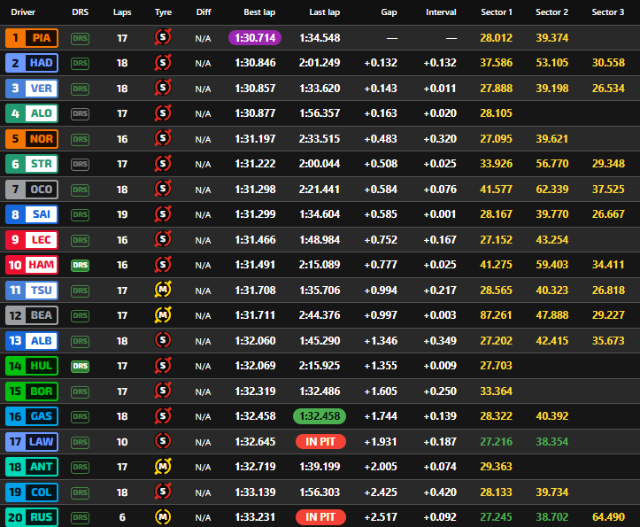 Oscar Piastri ha ottenuto, nella fase finale, la migliore prestazione in 1:30.714 con la McLaren, davanti alla Racing Bulls di Isack Hadjar (+0.132) e alla Red Bull di Max Verstappen. Buona la sessione di Fernando Alonso, quarto con l’Aston Martin davanti alla seconda McLaren di Lando Norris e alla seconda AMR25 di Lance Stroll.