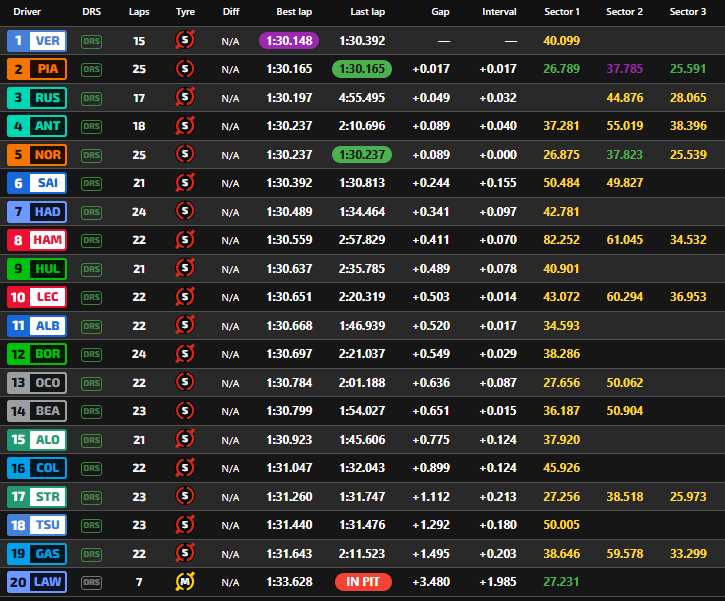 George Russell è, infatti, terzo a 49 millesimi da Verstappen: alle sue spalle c’è il compagno di squadra Kimi Antonelli, a 89 millesimi da Verstappen. A fine sessione, il suo tempo è stato pareggiato al millesimo da Lando Norris, classificato però quinto per aver ottenuto il crono dopo l’italiano.