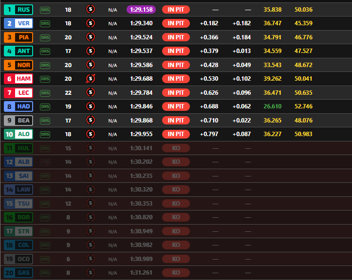 Vanno in Q3 Mercedes, Ferrari, Red Bull, Verstappen, Hadjar, Antonelli e Alonso. Russell segna 1:29.165 con una toccata alla penultima curva, Antonelli è secondo a 372 millesimi. Norris è lontano 4 decimi e mezzo, Leclerc oltre sei decimi con Hamilton a mezzo secondo. Piastri si porta in seconda posizione, Verstappen lo supera! La situazione vede quindi Russell, Verstappen, Piastri, Antonelli, Norris, Hamilton e Leclerc. Si riparte a 2 dalla fine. Russell migliora di 7 millesimi, gli altri non ci riescono e quindi è Pole per l’inglese, la seconda dell’anno.