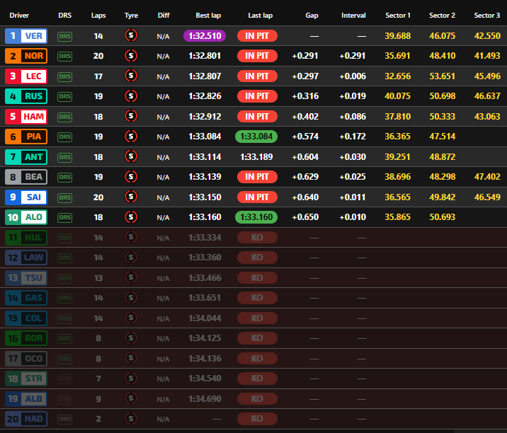 La Q3 inizia con i piloti che escono ben distanziati uno con l’altro. Il primo giro cronometrato è di Bearman in 1:33.139. Piastri è dietro l’inglese di tre decimi, Russell si mette in testa in 1:32.959. Norris migliora il tempo della Mercedes in 1:32.904 ma poi arriva Verstappen che scende a 1:32.510 e si mette in testa con quattro decimi sulla McLaren #4. L’olandese precede quindi Norris, Russell, Antonelli, un grande Bearman, Sainz, Piastri, Alonso, Hamilton e Leclerc. Sia l’inglese che il monegasco hanno compromesso il loro primo giro rispettivamente con un errore in curva 1 e un testacoda nell’ultima. I due rossi ci riprovano subito: Leclerc sale in seconda posizione, Hamilton in quarta. Verstappen non ha tempo per il secondo giro ma resta in Pole. Norris si riprende la seconda posizione, Piastri è solo in sesta.