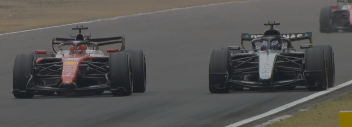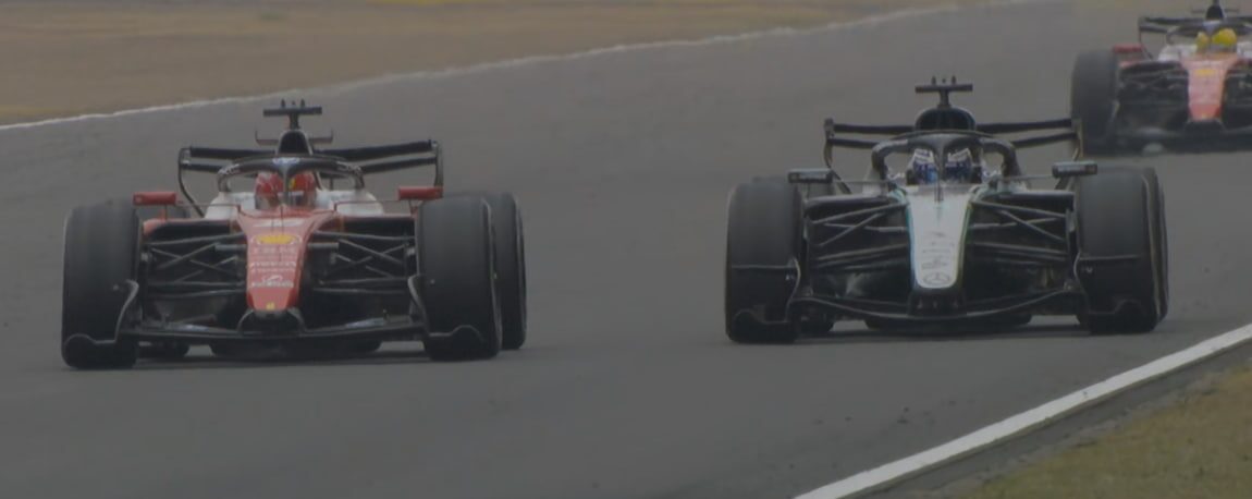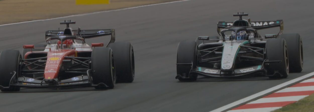 In questo primo screen sia la Ferrari di Leclerc che la Mercedes di Russell sono configurate in “Straight Mode”. Su entrambe le vetture, sia l’ala anteriore che la posteriore sono abbassate per favorire l’efficienza sul dritto.