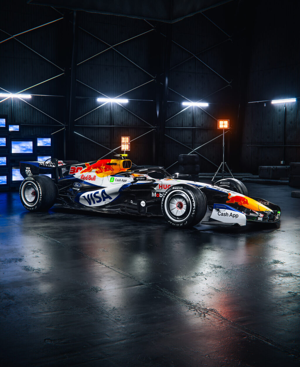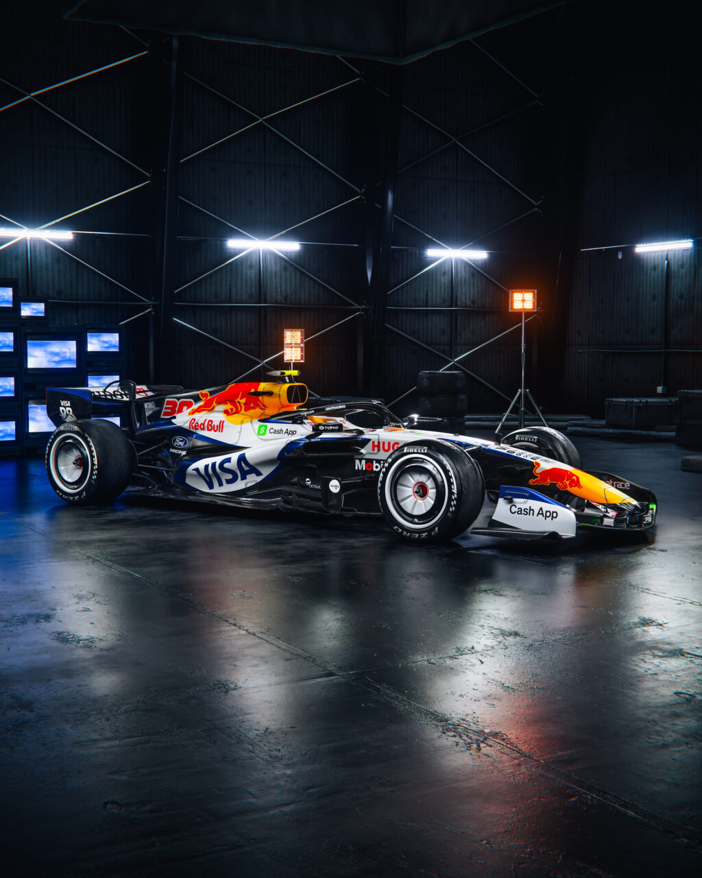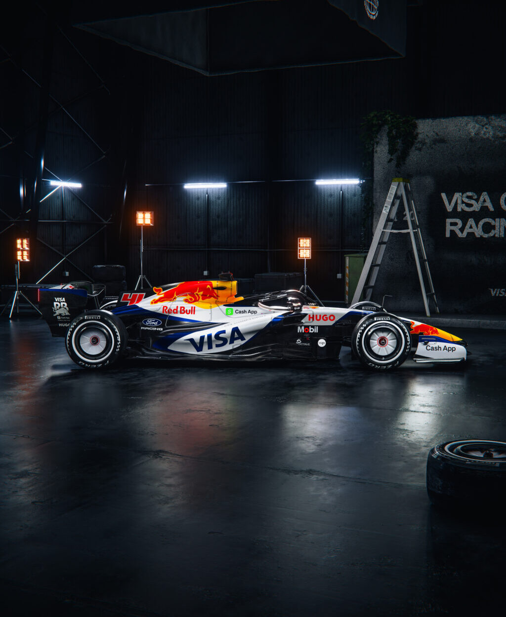 Dai render pubblicati, la livrea richiama quella della VCARB 02, con un bianco predominante integrato da inserti blu Ford al posteriore, sulla parte frontale delle fiancate e ai lati del telaio anteriore. Rinnovato il font dei numeri su muso e pinna posteriore, con Liam Lawson che proseguirà con il suo 30 mentre il nuovo arrivato, Arvid Lindblad, ha optato per il 41.