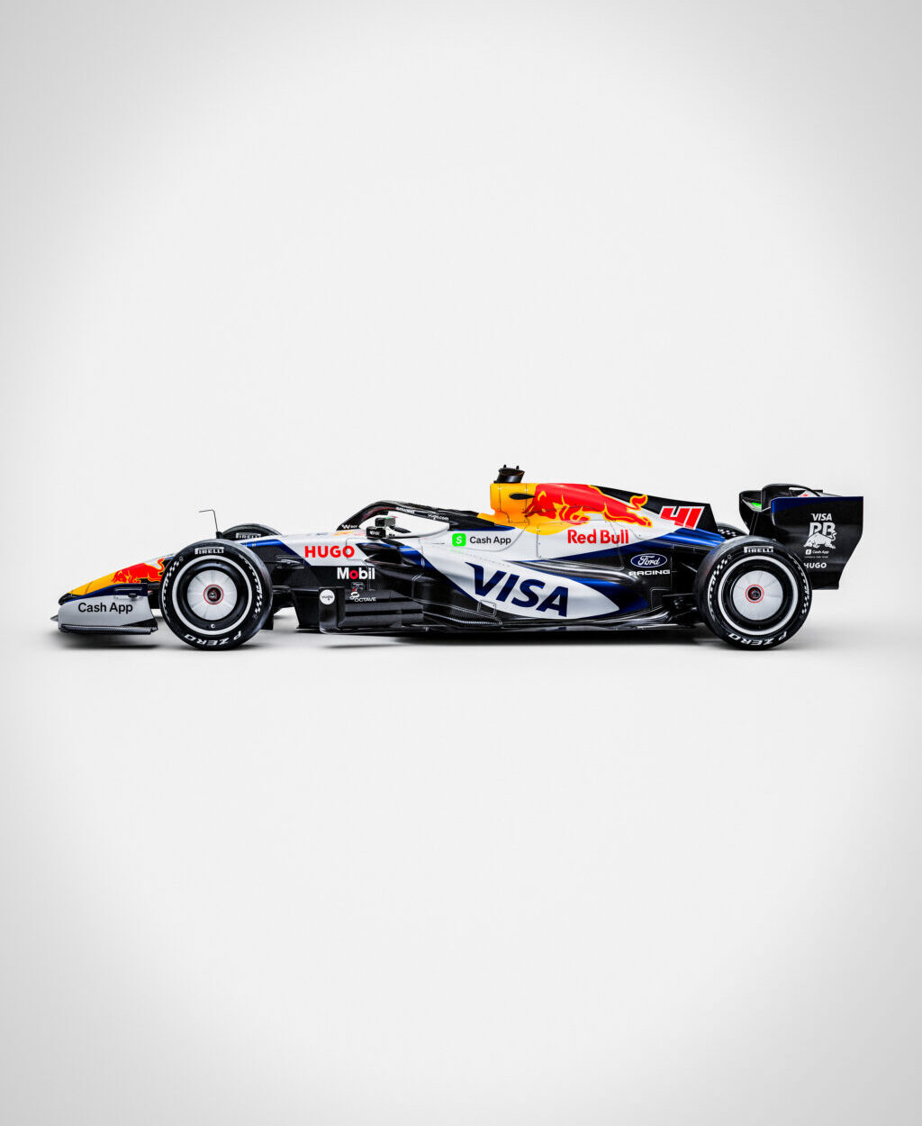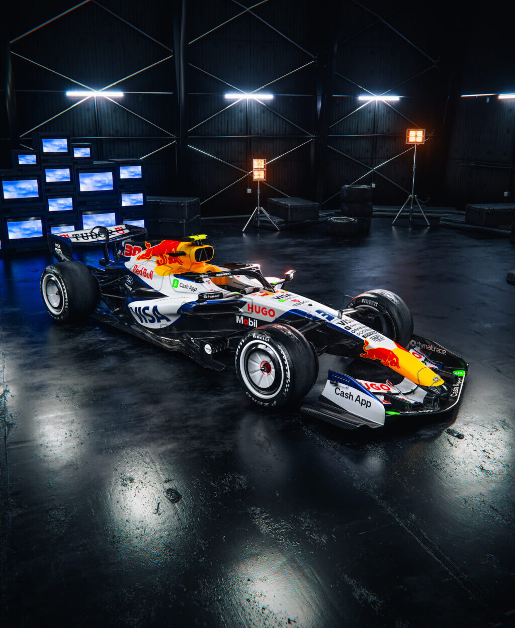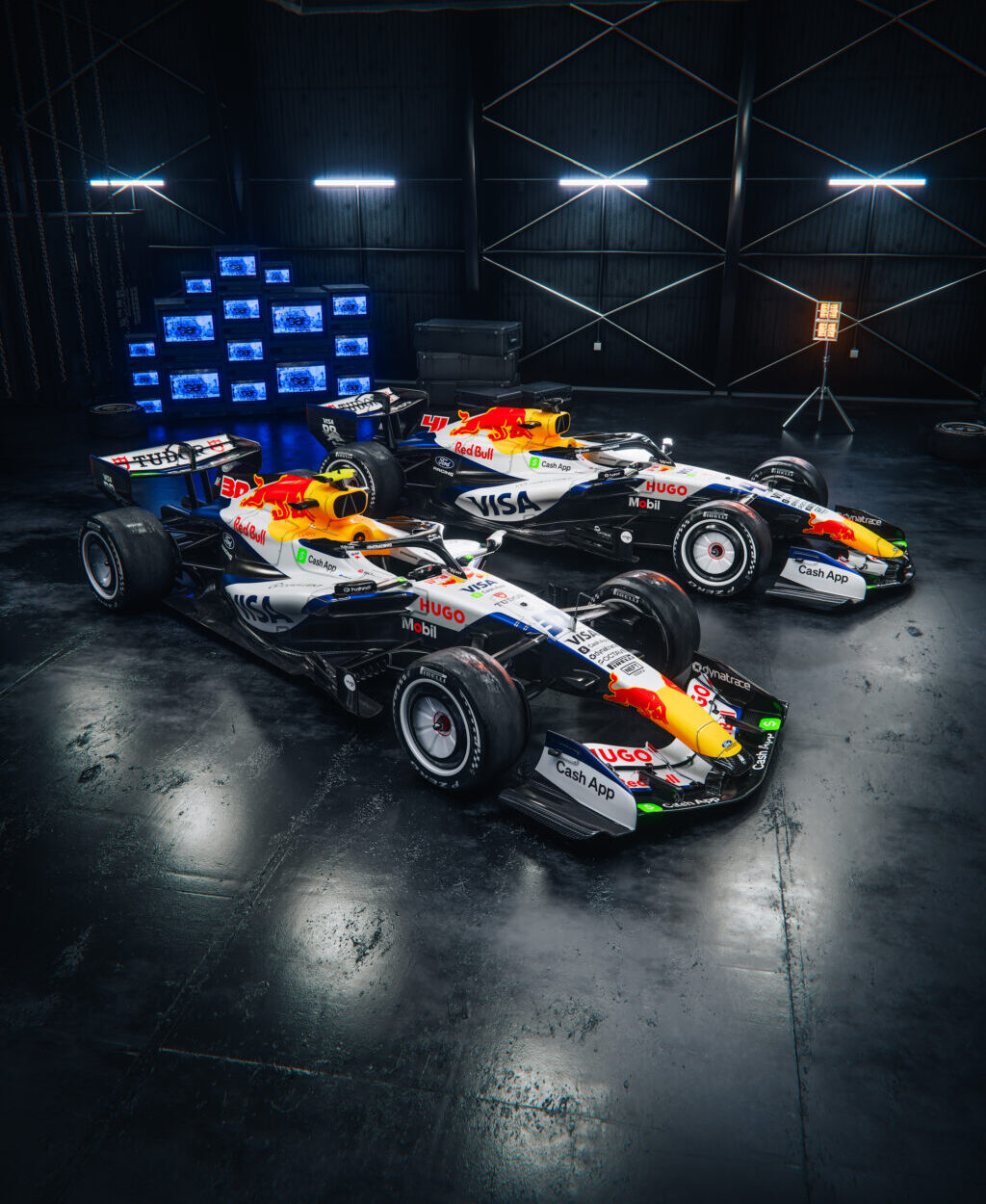 Dai render pubblicati, la livrea richiama quella della VCARB 02, con un bianco predominante integrato da inserti blu Ford al posteriore, sulla parte frontale delle fiancate e ai lati del telaio anteriore. Rinnovato il font dei numeri su muso e pinna posteriore, con Liam Lawson che proseguirà con il suo 30 mentre il nuovo arrivato, Arvid Lindblad, ha optato per il 41.