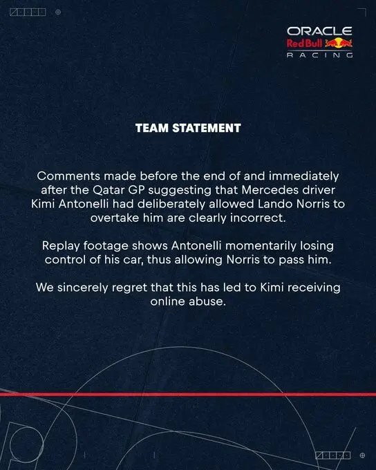 Red Bull ha diramato un comunicato sui suoi canali social per distaccarsi dai commenti che, da ieri sera, stanno colpendo Kimi Antonelli, reo secondo una frangia social piuttosto malevola di aver fatto passare deliberatamente Lando Norris nelle fasi finali del GP del Qatar; permettendo, così, all’inglese di recuperare 2 punti su Max Verstappen nella lotta iridata che si concluderà questo fine settimana ad Abu Dhabi.