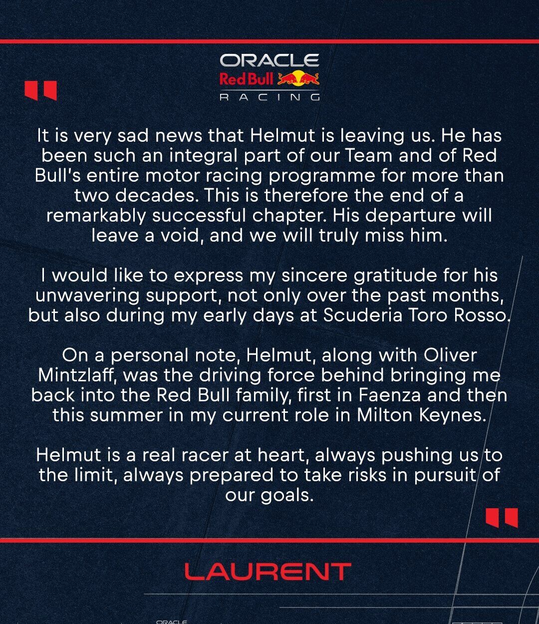 “È una notizia davvero triste quella dell’addio di Helmut. È stato una parte fondamentale del nostro team e dell’intero programma motoristico Red Bull per più di vent’anni. È quindi la fine di un capitolo straordinariamente vincente. La sua partenza lascerà un vuoto, e ci mancherà davvero.
