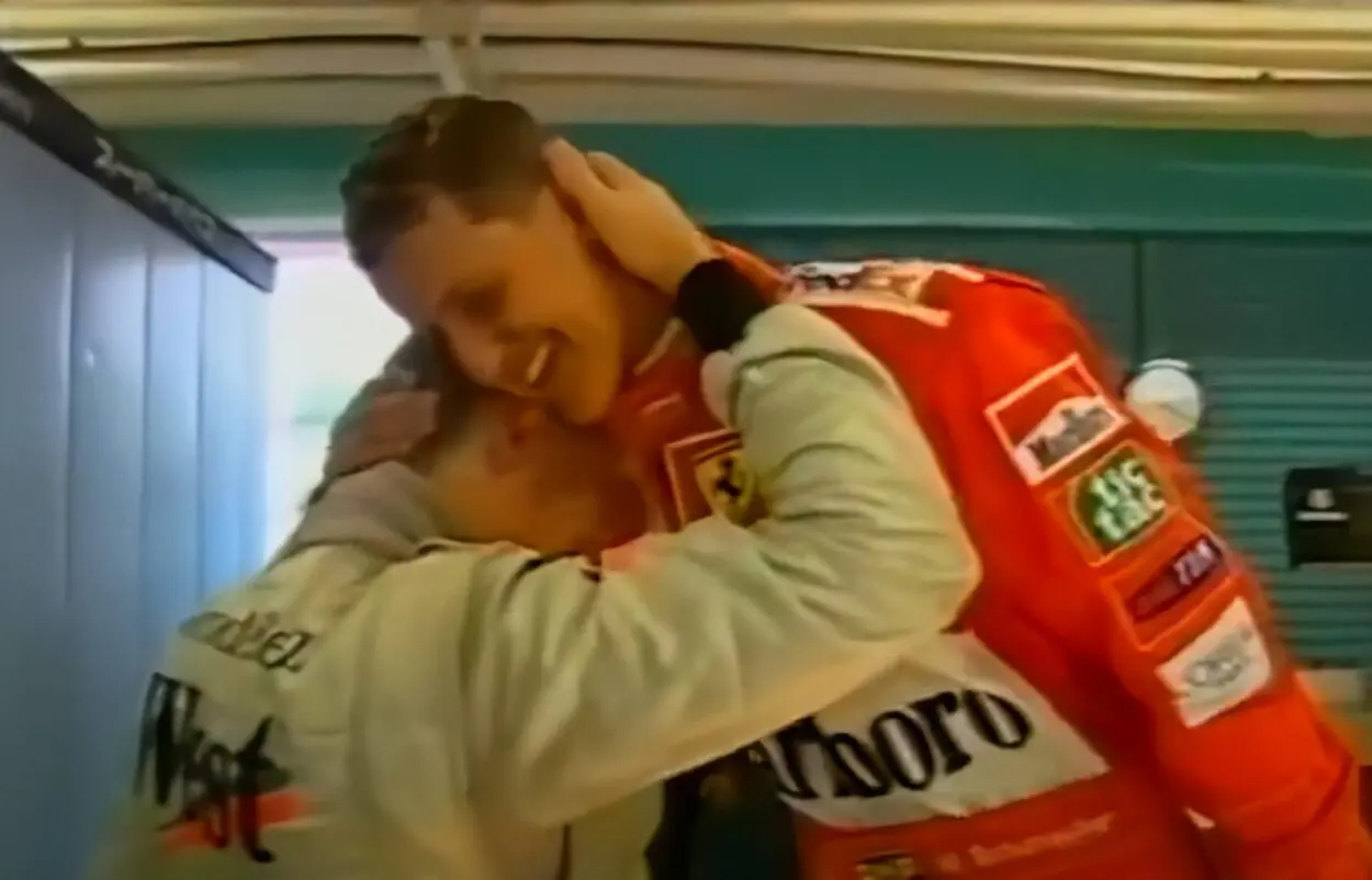 L’immagine di una rivalità. Schumi e Hakkinen si ritrovano al peso: ridono, scherzano, si abbracciano. Quasi non sembrano piloti che hanno corso con il coltello tra i denti fino a dieci minuti prima per contendersi il titolo. Il finlandese sarà sempre indicato da Michael come il rivale migliore della sua carriera e lo stesso varrà per tanti suoi tifosi.