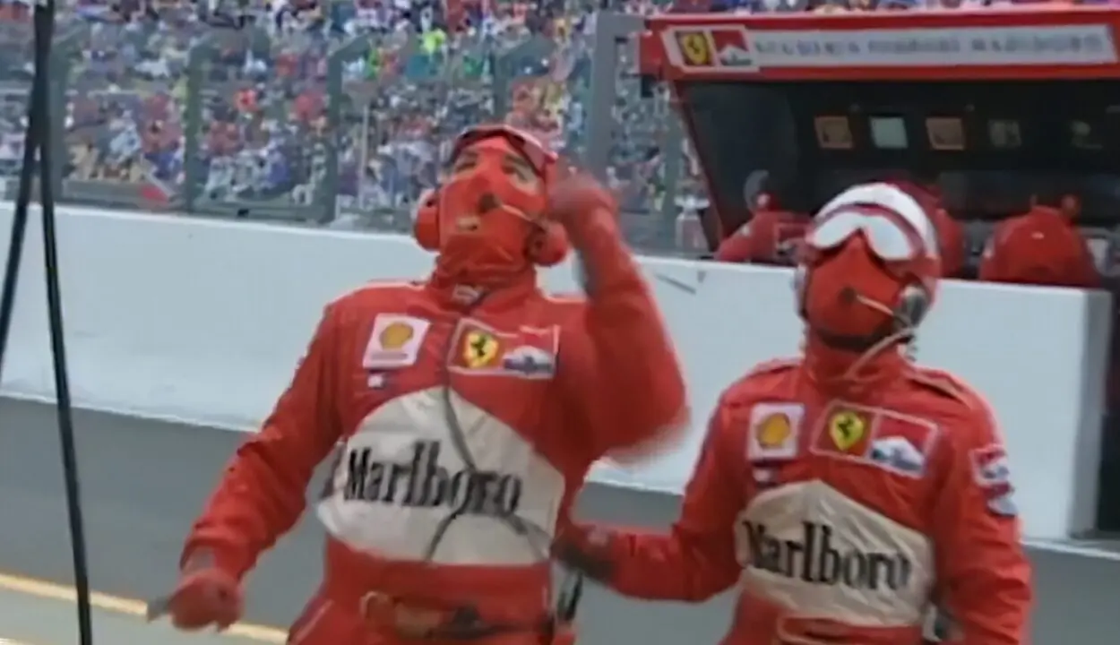 Arriva finalmente la cerimonia del podio, quella che per tanti anni i tifosi della Ferrari hanno atteso, con la consapevolezza di aver chiuso un cerchio lunghissimo. Schumi salta sul gradino più alto come da suo marchio di fabbrica, ascolta l’inno tedesco con le mani dietro la schiena e poi diventa il direttore d’orchestra del giorno per quello italiano, mentre le telecamere inquadrano Corinna in lacrime e i meccanici in festa.