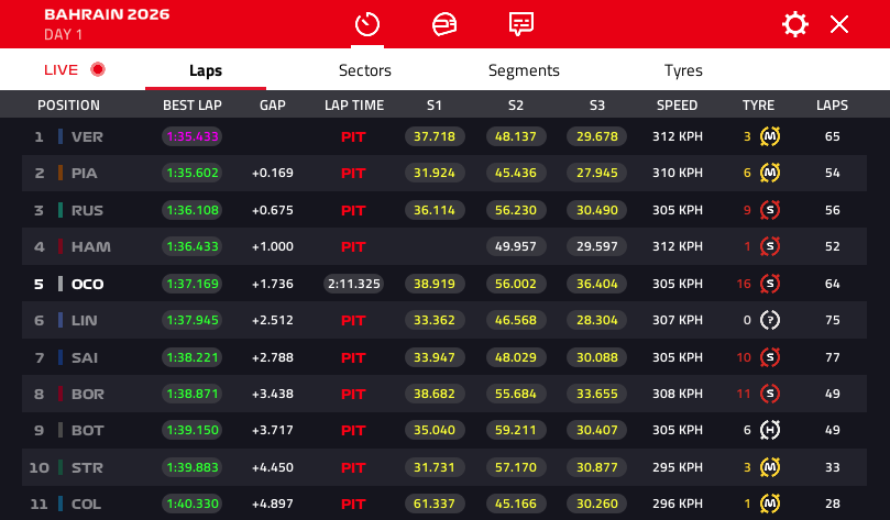 In generale, sessione con tanti giri completati senza problemi gravi. Si riprende alle 13: Verstappen, Lindblad, Stroll e Ocon guideranno anche al pomeriggio, mentre gli altri team effettueranno il cambio pilota.