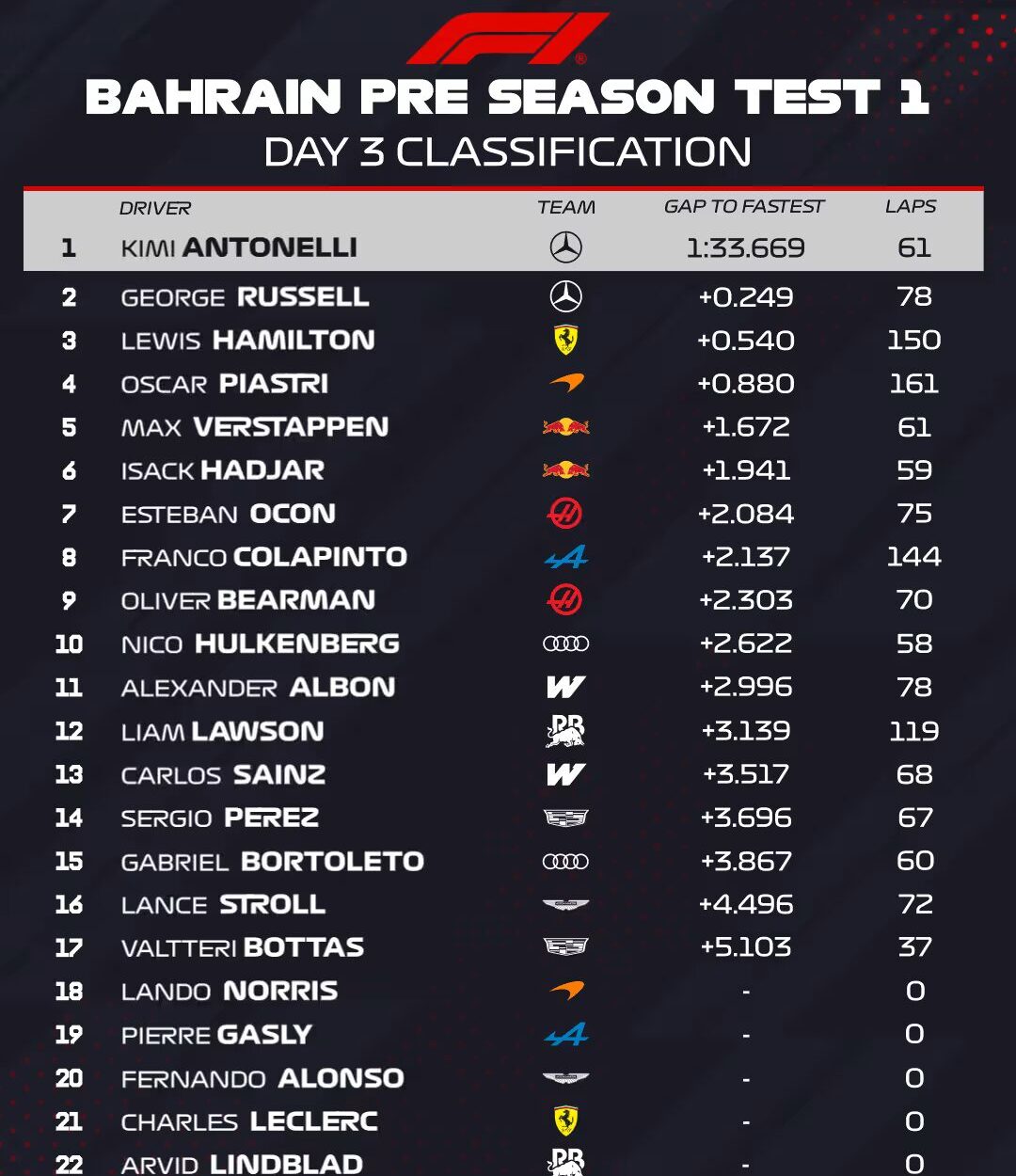 È andata in archivio, con la Mercedes davanti a tutti, la prima tre giorni di test F1 2026 in Bahrain. Il team di Brackley, con Kimi Antonelli e George Russell, ha ottenuto i due migliori tempi di questa sessione proprio nell’ultima giornata, nella quale si sono alternati al volante della W17 per un totale di 139 giri completati.