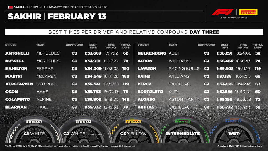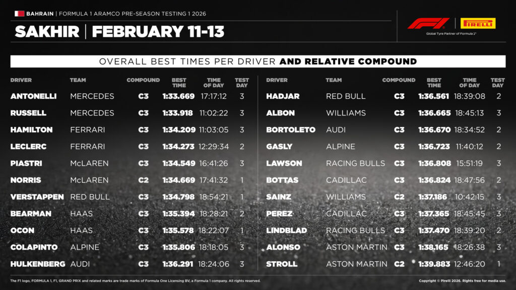 Il primo test pre-stagionale in Bahrain si chiude con una doppietta Mercedes in cima alla classifica tempi. Kimi Antonelli ha concluso il suo giro migliore in 1:33.669s battendo il tempo del compagno George Russell di 0,249s. Dietro di loro, il ferrarista Lewis Hamilton che ha fermato il cronometro a 1:34.209s. I tre piloti, su C3, non solo hanno primeggiato oggi ma sono stati i più veloci in questi tre giorni a Sakhir.