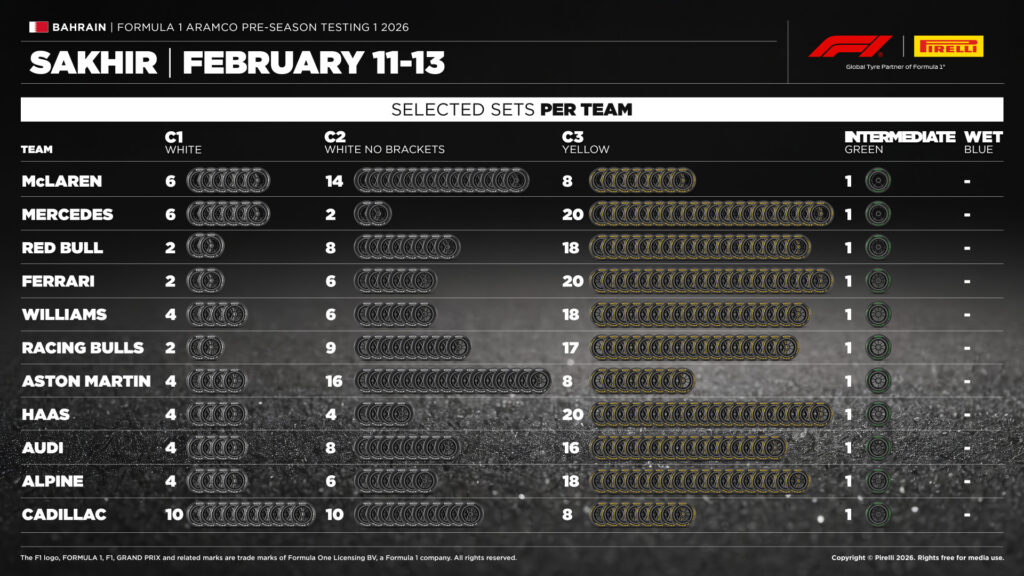 Nei primi tre giorni, dunque durante il primo test pre‑stagionale, le squadre potranno utilizzare esclusivamente le mescole slick dalla C1 alla C3. Ogni team avrà a disposizione 28 set di gomme da asciutto e, obbligatoriamente, un set di Cinturato Intermediate.