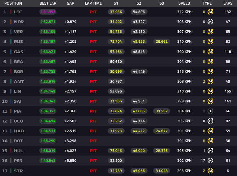 Oscar Piastri, Esteban Ocon e Isack Hadjar sono 11°, 12° e 13° con i tempi del mattino e precedono Valtteri Bottas: il finlandese ha portato a termine 38 passaggi nel pomeriggio dopo i 61 di Pérez del mattino. I tempi sembrano ancora lontani, ma la vettura del nuovo team quanto meno macina chilometri, la cosa più importante al momento.