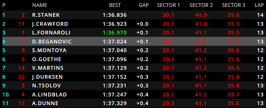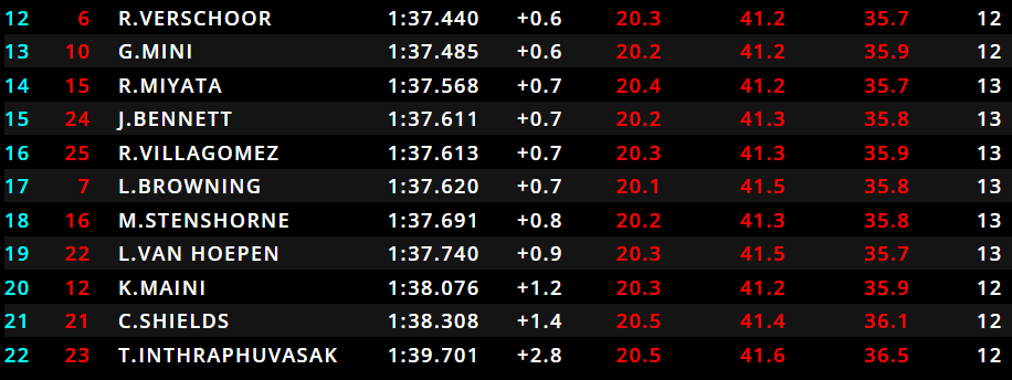 Roman Stanek (1.36.836″) e Leonardo Fornaroli (1.36.970″), piloti di Invicta Racing, si portano in alto, ottenendo il primo e il terzo tempo della sessione. Jak Crawford, secondo, conferma la forma della mattinata piazzandosi a soli 87 millesimi dal poleman. Minì ottiene il tredicesimo tempo nonostante il gap di soli 6 decimi dal leader.
