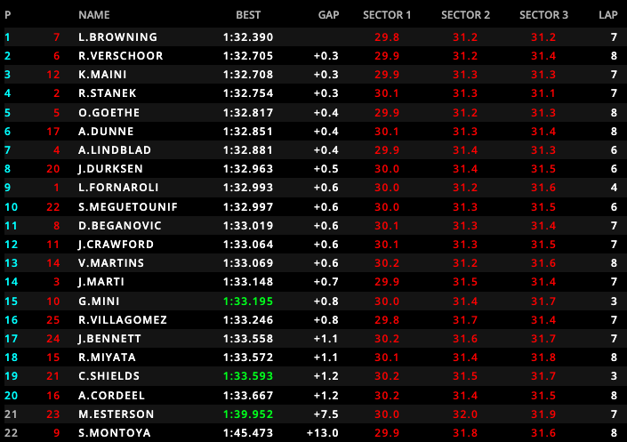 Nel secondo tentativo e a tredici minuti dal termine, Luke Browning e Richard Verschoor hanno migliorato il proprio crono, con l’inglese che è passato in prima posizione in 1:32.390. Tuttavia i colpi di scena sono proseguiti con l’altro italiano della griglia, Leonardo Fornaroli, che si è fermato in prossimità della Parabolica. Questo ha portato un’ulteriore sospensione della sessione.