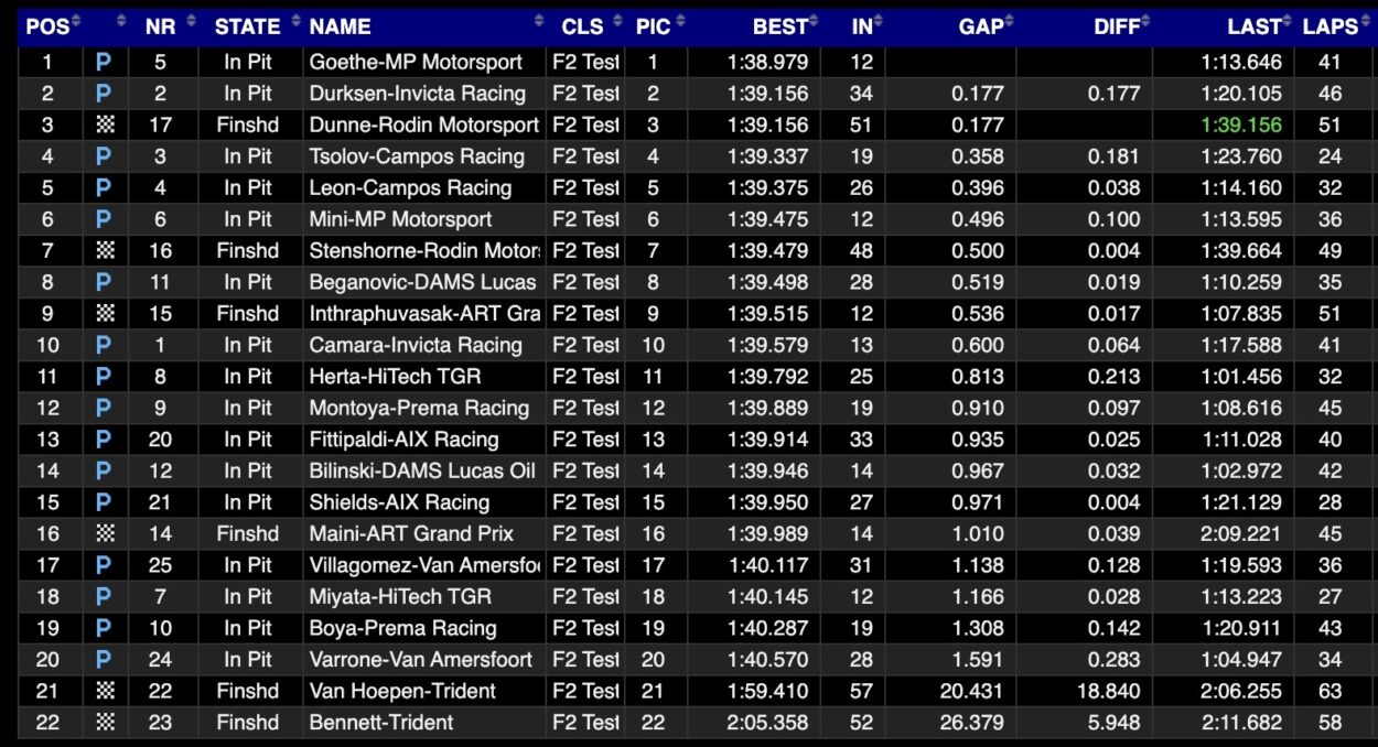 Alle spalle del 1:38.979 di Goethe troviamo ancora una volta una delle monoposto di Invicta Racing, in particolare quella guidata da Durksen, a un decimo, con Camara a chiudere i primi dieci con quattro decimi di ritardo sul compagno di squadra.