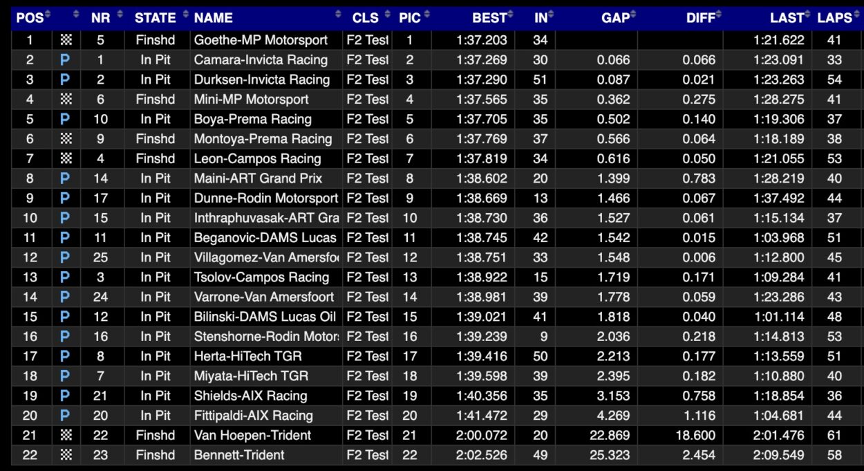 Scorrendo lungo la colonnina dei tempi incontriamo Gabriele Minì, nella seconda delle monoposto MP Motorsport, Mari Boya, che nel 2026 sarà rookie in categoria con Prema Racing, e Sebastian Montoya, futuro compagno di squadra di Boya al via per la sua seconda stagione in F2.