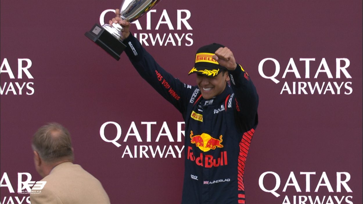 Lindblad ha costruito la propria vittoria passando dalle gomme da bagnato a quelle d’asciutto al termine del giro di formazione (seguito da tanti altri piloti) recuperando posizioni nei primi giri e rimanendo poi con le coperture slick anche nelle fasi in cui la pioggia è caduta nella parte centrale della gara, riuscendo non solo a rimanere in pista con condizioni di aderenza ridotta ma anche evitando di rimanere coinvolto negli incidenti che hanno portato ai due ingressi in pista della Safety Car.