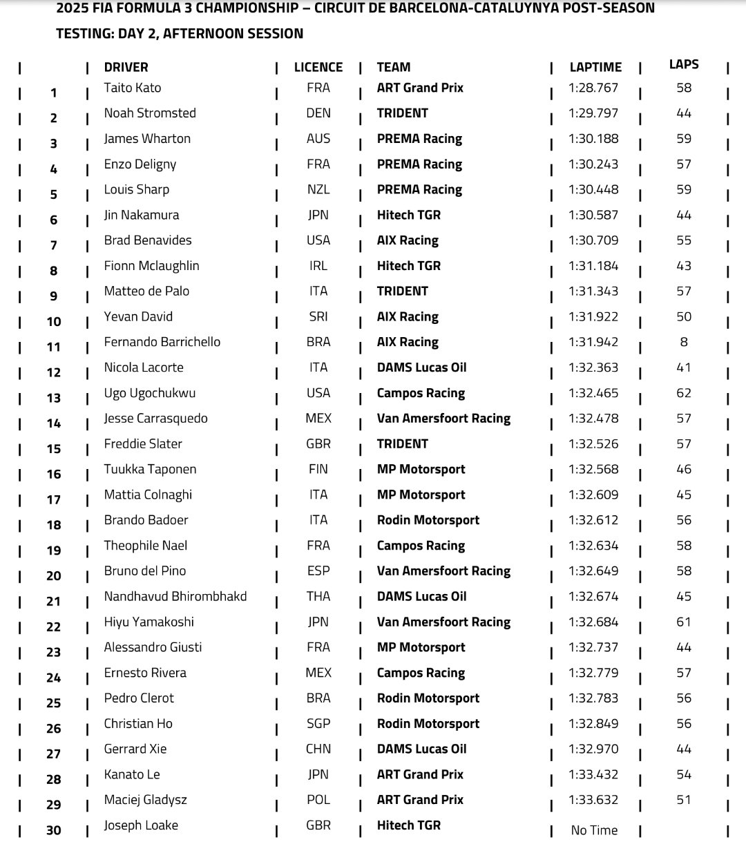 Nel pomeriggio i tempi sono stati più alti, con Taito Kato autore del miglior tempo della sessione in 1:28.767 firmato a circa metà turno. Il Rookie giapponese, non ancora confermato in ART Grand Prix per il campionato 2026, ha avuto la meglio su Noah Stromsted, secondo al pomeriggio ma con un gap di un secondo dalla vetta.