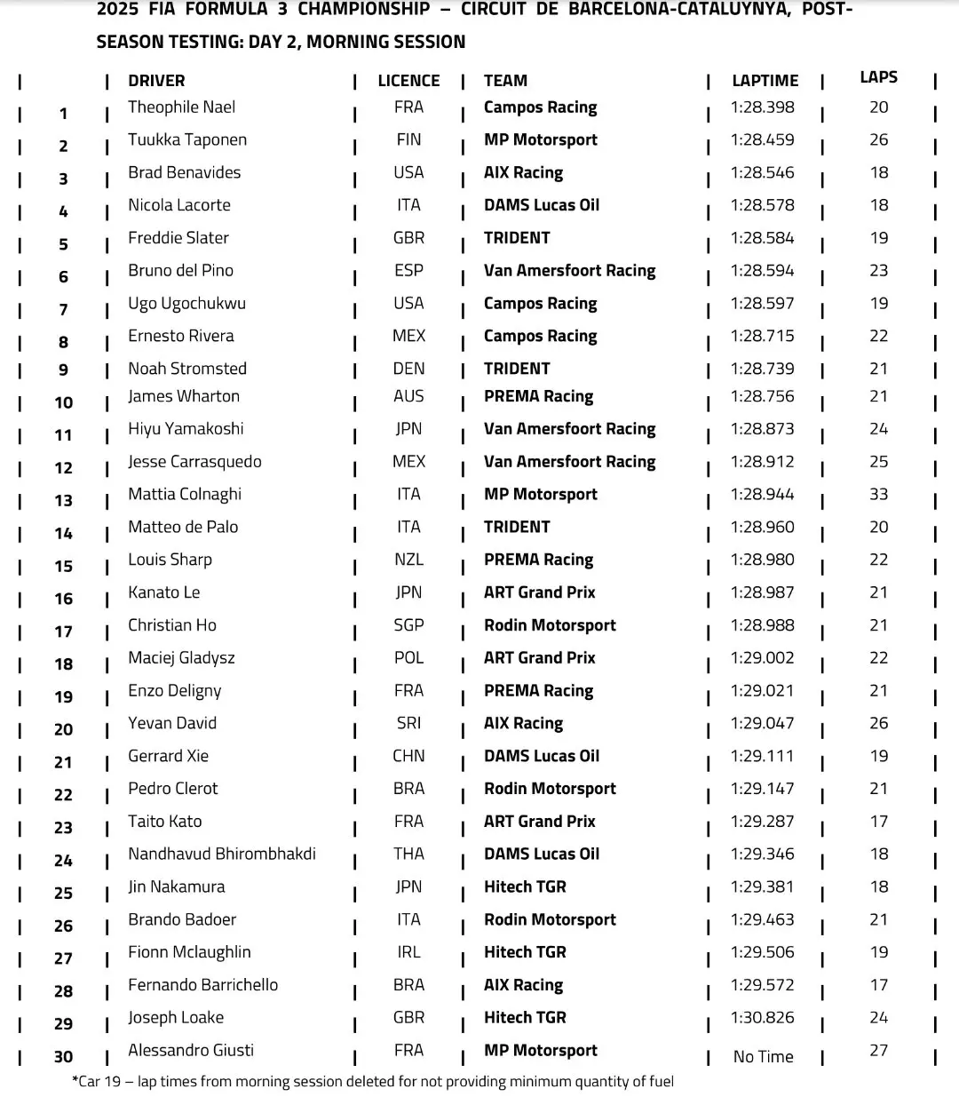 Alle spalle del britannico, il migliore tra i debuttanti, troviamo Bruno Del Pino ed il duo Campos Racing formato da Ugo Ugochukwu, settimo dopo il miglior tempo ottenuto nel Day 1, ed Ernesto Rivera, ottavo ad oltre tre decimi da Nael in vetta. La Top10 del turno mattutino viene completata da Noah Stromsted e James Wharton, rispettivamente in nona e decima posizione separati da 17 millesimi. Più indietro Mattia Colnaghi e Matteo De Palo, autori del 13° e 14° tempo, mentre Brando Badoer ha chiuso nelle retrovie in 26° posizione.