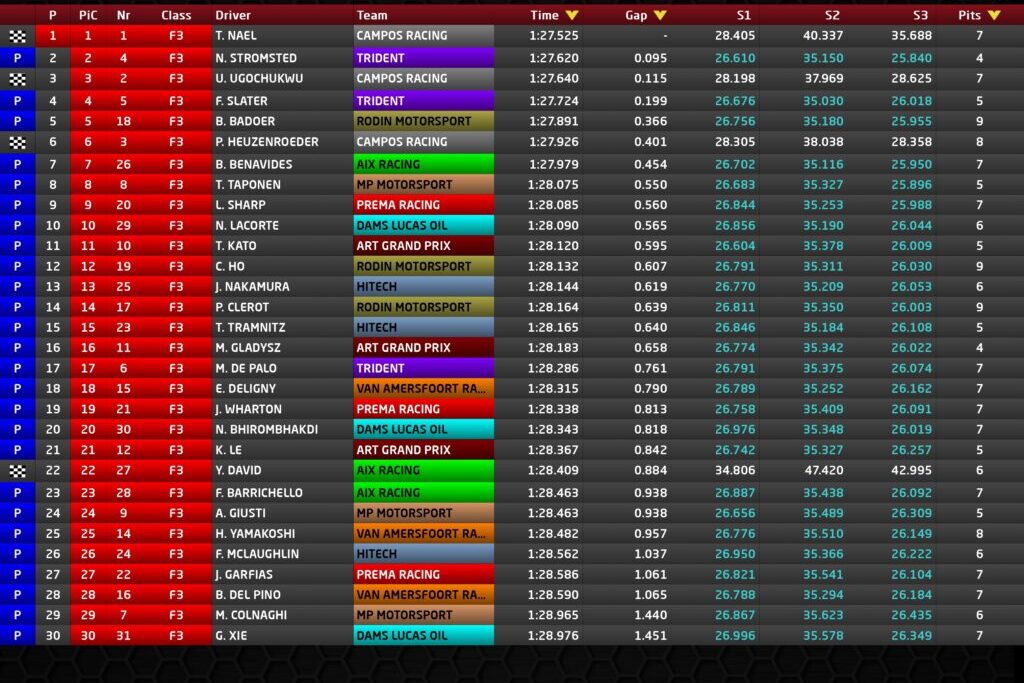 La sessione mattutina è iniziata con un fuori pista, per fortuna senza conseguenze, di James Wharton. Il pilota Prema Racing ha perso il controllo della vettura tra la curva sette ed otto, provocando la predisposizione della bandiera rossa. Dopo una breve interruzione, i piloti sono tornati in pista per iniziare il programma della giornata con la simulazione qualifica. Il primo a montare le gomme nuove e a far segnare un tempo degno di nota al cronometro è stato Noah Strømsted, in 1:27.620, per poi essere declassato in seconda posizione da Théophile Naël con un crono di 1:27.525, novantacinque millesimi più veloce.