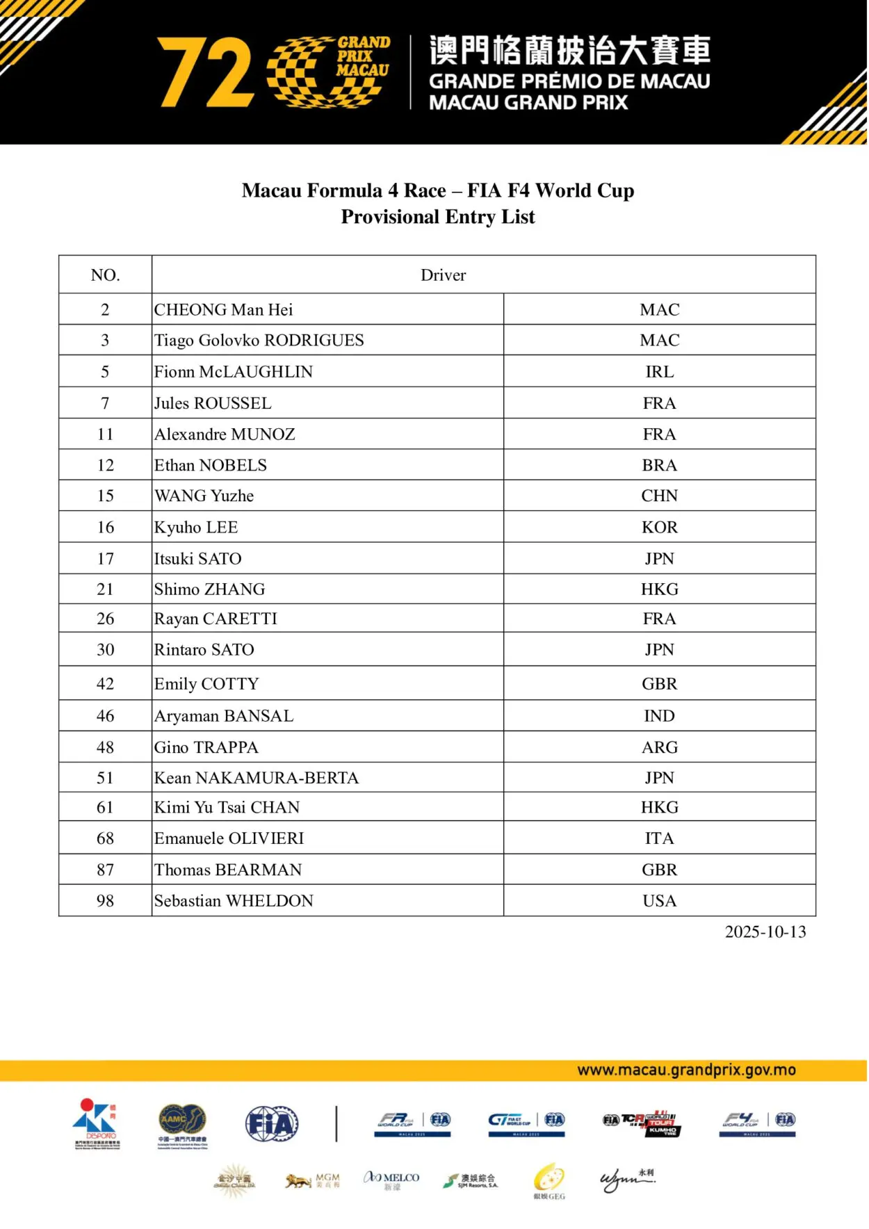 Spazio anche per il campione della Formula 4 CEZ Gino Trappa e per il campione della Chinese Formula 4 Shimo Zhang, visti in passato anche nel campionato italiano. Presente anche l’attuale leader della Japanese Formula 4 Itsuki Sato, leader a due weekend dal termine, e Tiago Rodrigues, visto ad inizio anno nella Formula 4 Middle East e presente nell’ultima edizione della gara di Formula 4 a Macao del 2023. Sotto, la completa Entry List della FIA F4 World Cup 2025: