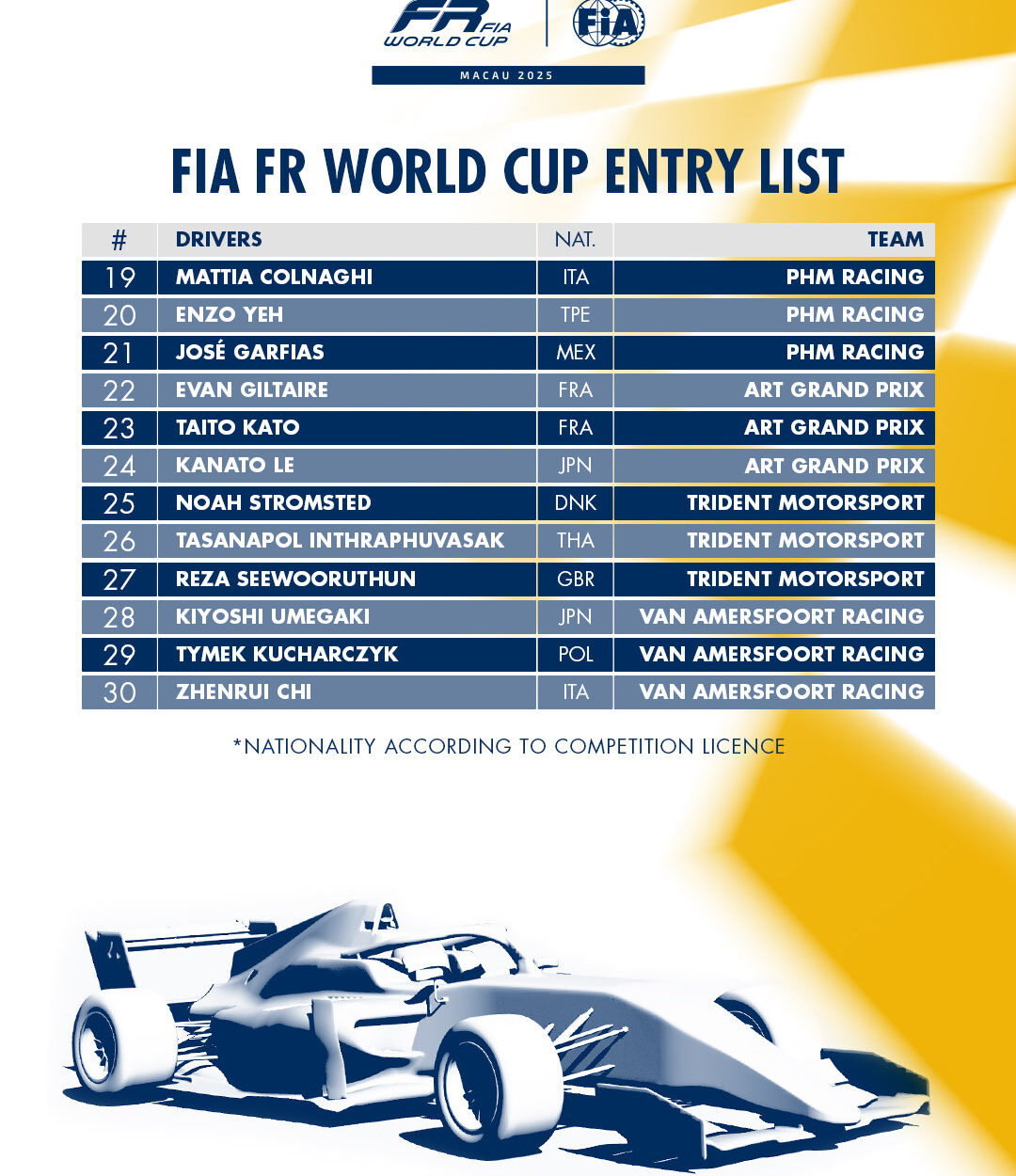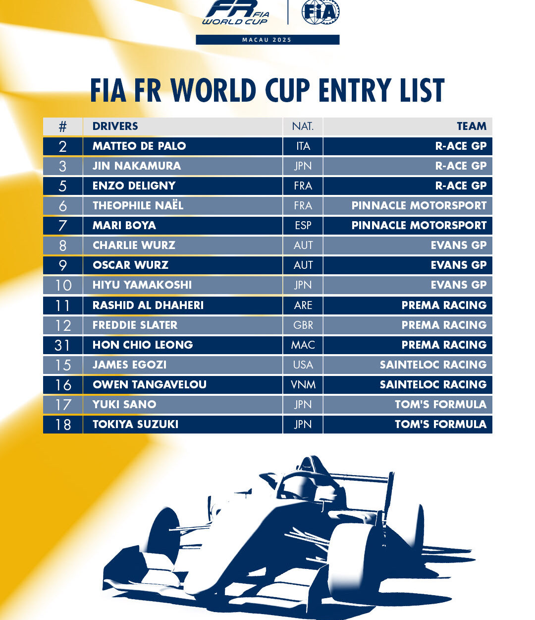 Annunciata dal Comitato Organizzatore del Gran Premio di Macao in collaborazione con la Fédération Internationale de l’Automobile (FIA) oggi (13 ottobre), la lista degli iscritti comprende 10 squadre internazionali di monoposto di primo livello e una formazione completa di 27 piloti tutti sotto i 25 anni di età.